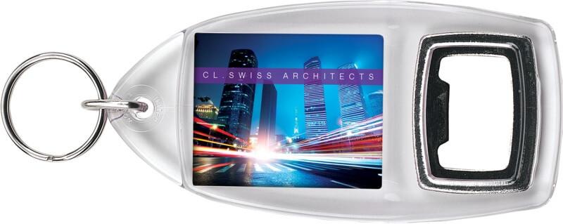 Porta-chaves transparente R1 com abre-garrafas e argola em metal. A argola de metal oferece um perfil liso que é ideal para envio pelo correio. Dimensões do papel impresso: 4,0 cm, x 3,2 cm.