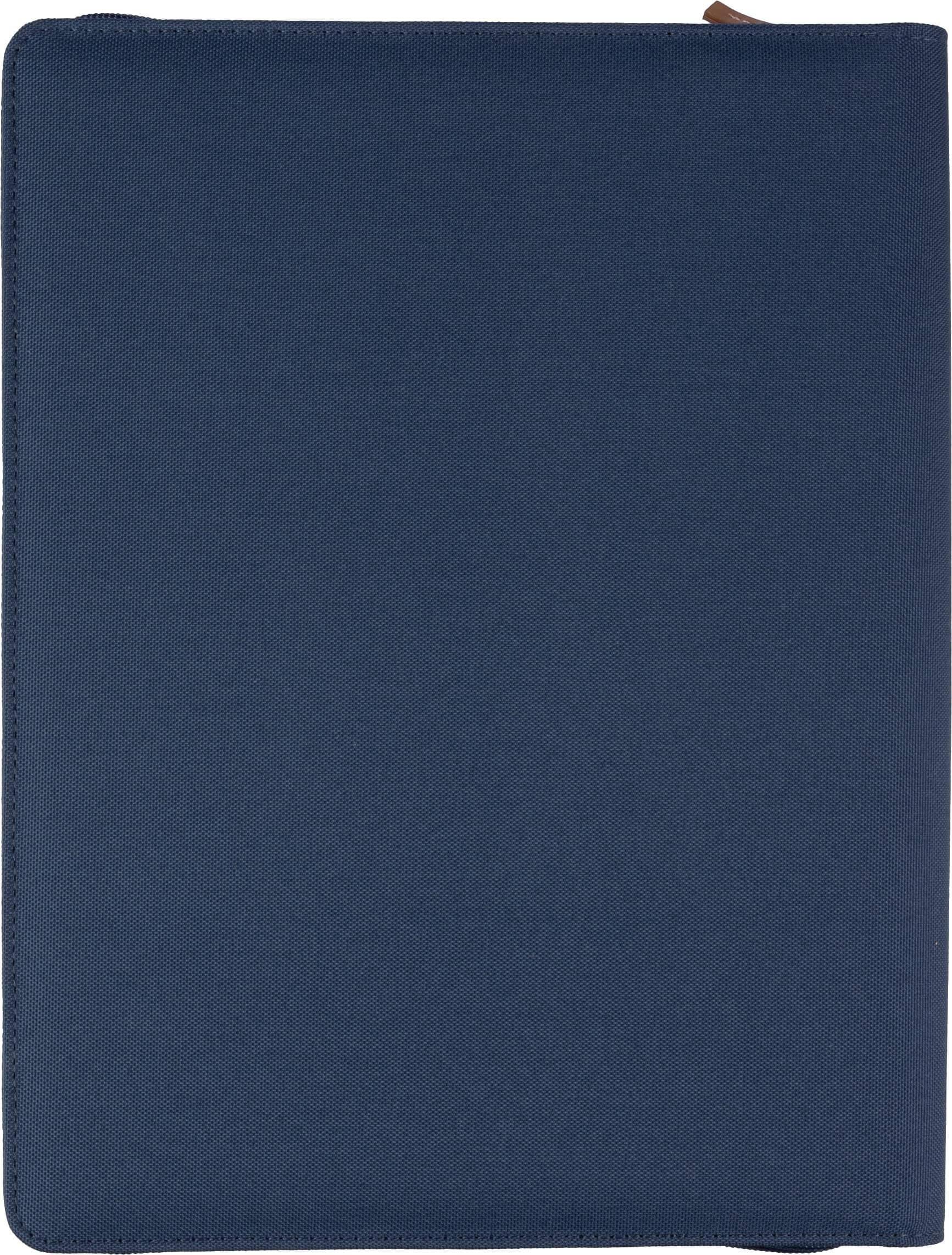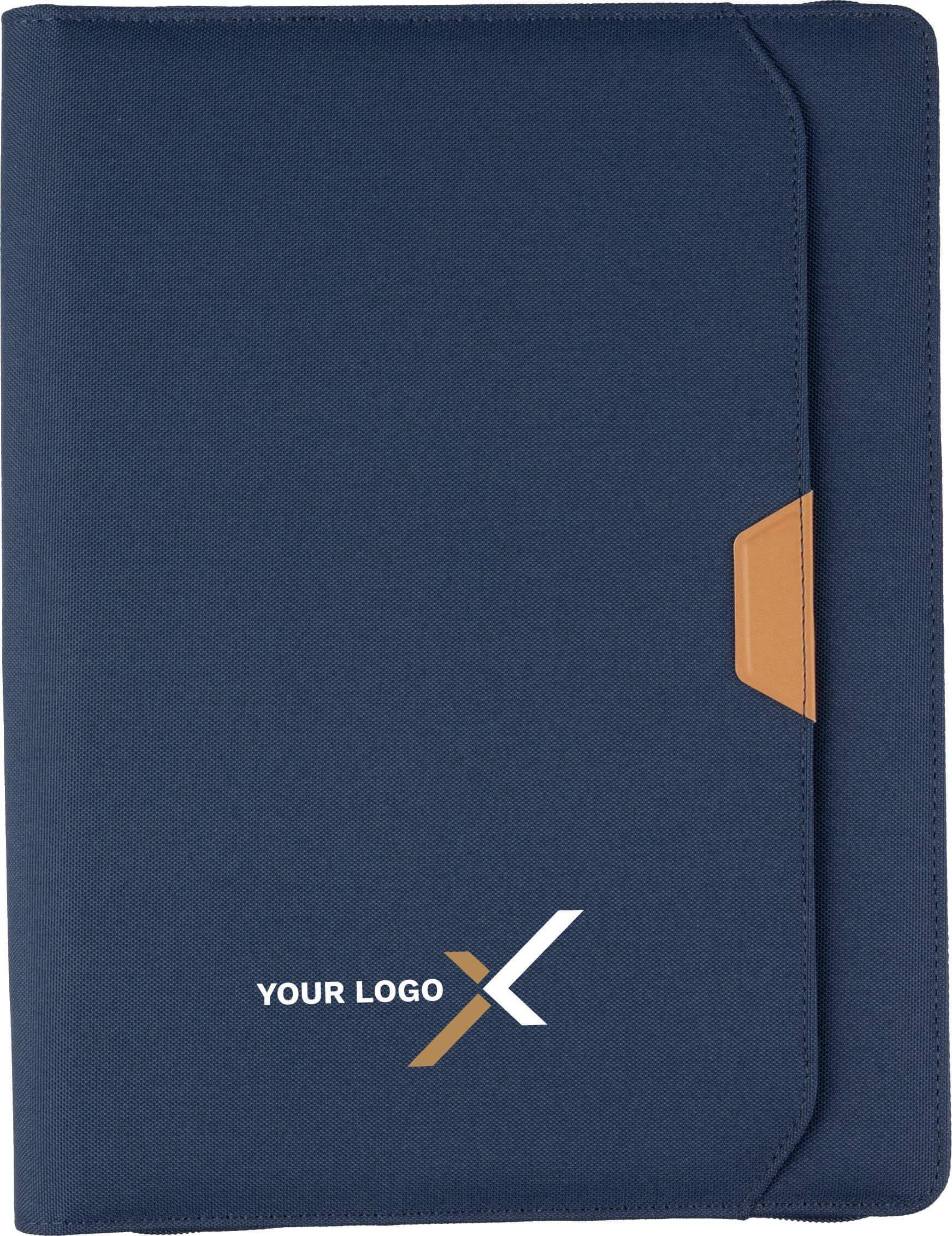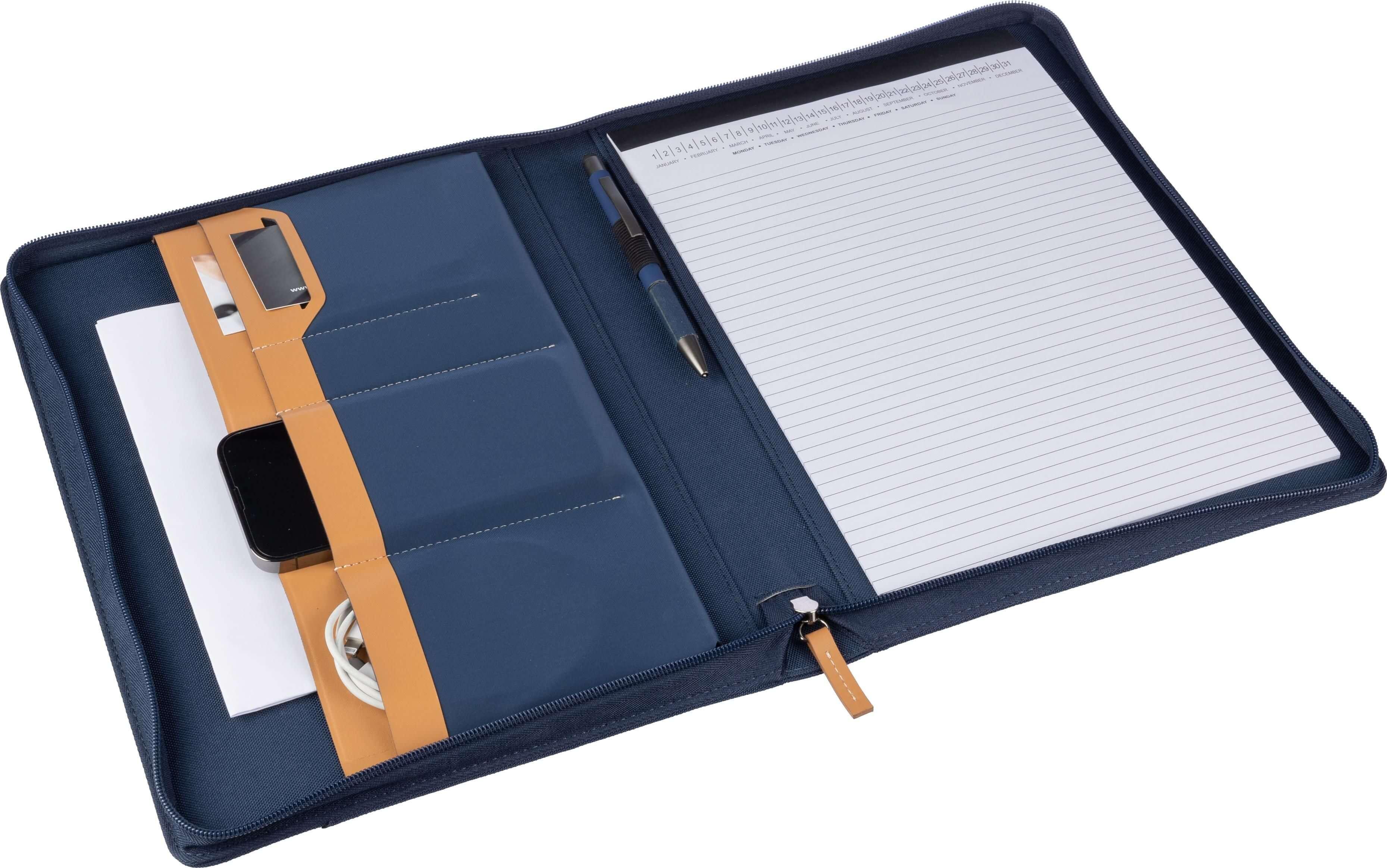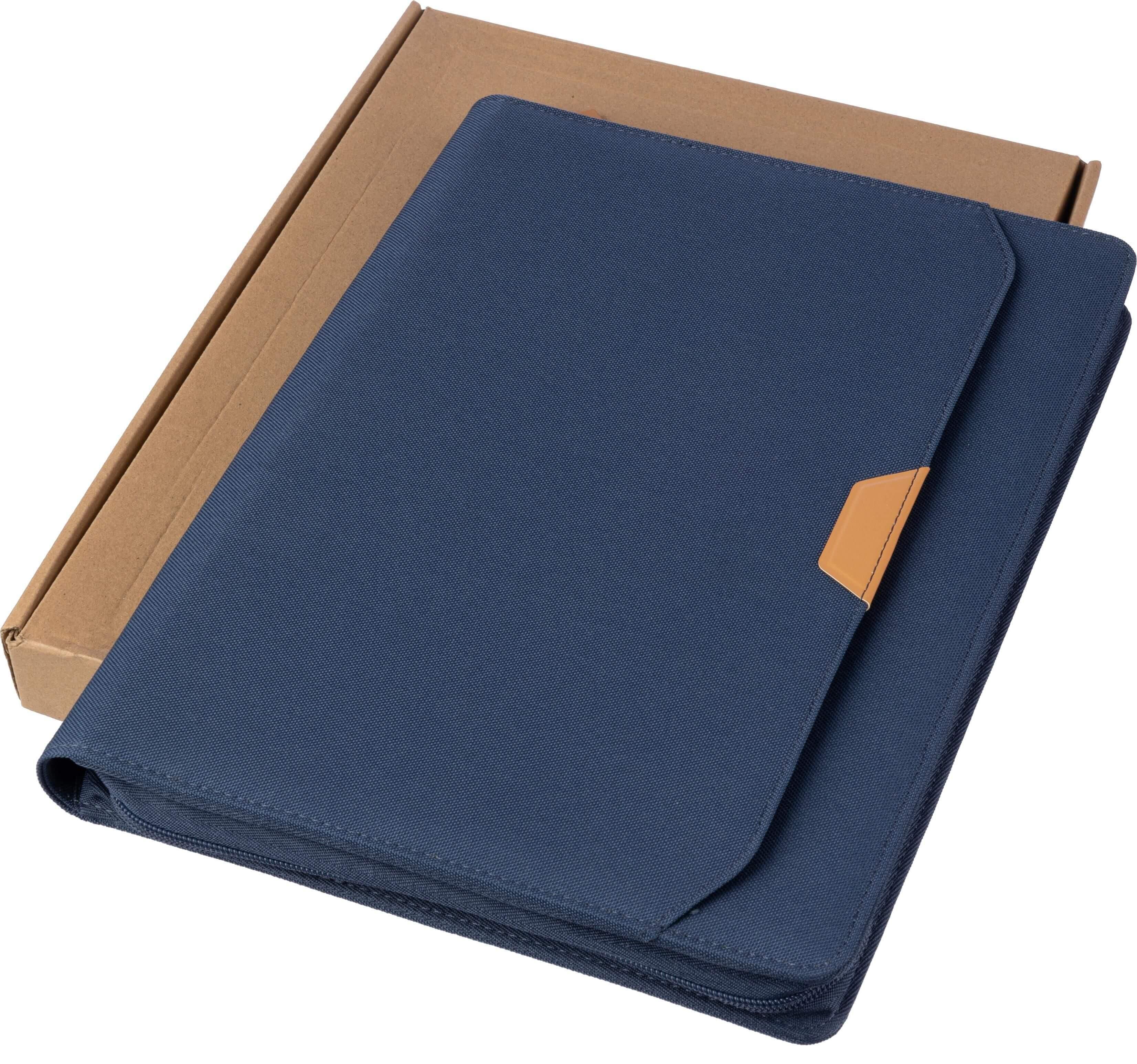 Porta-documentos rPET (aprox. A4) com pormenor em PU e fecho de correr. Inclui um bloco de notas com 20 folhas pautadas (70 g/m²), vários compartimentos e um suporte para esferográficas. O caderno e o papel nesta pasta são certificados FSC® Mix. Pequeno bolso na parte da frente. Apresentado numa caixa Kraft castanha.