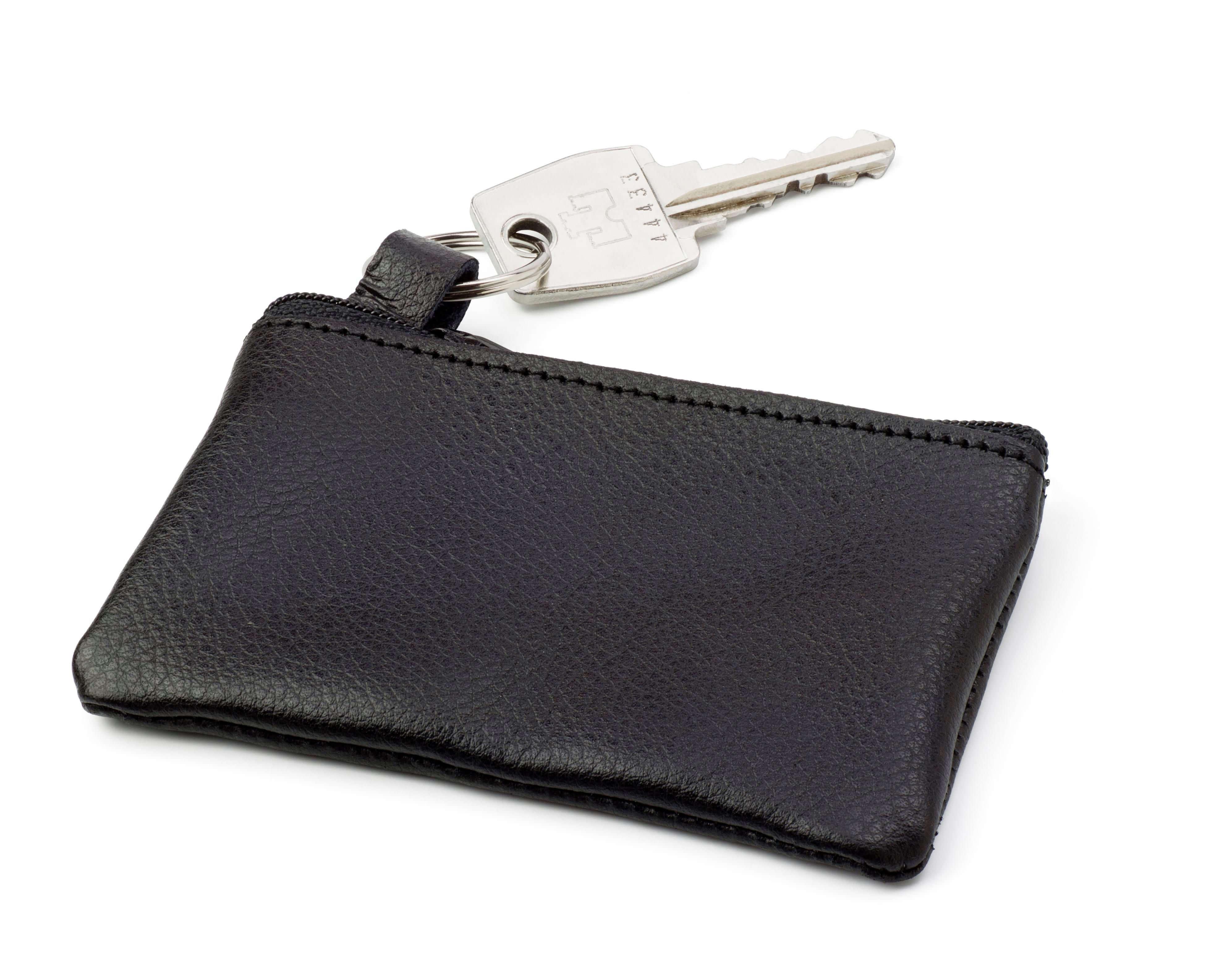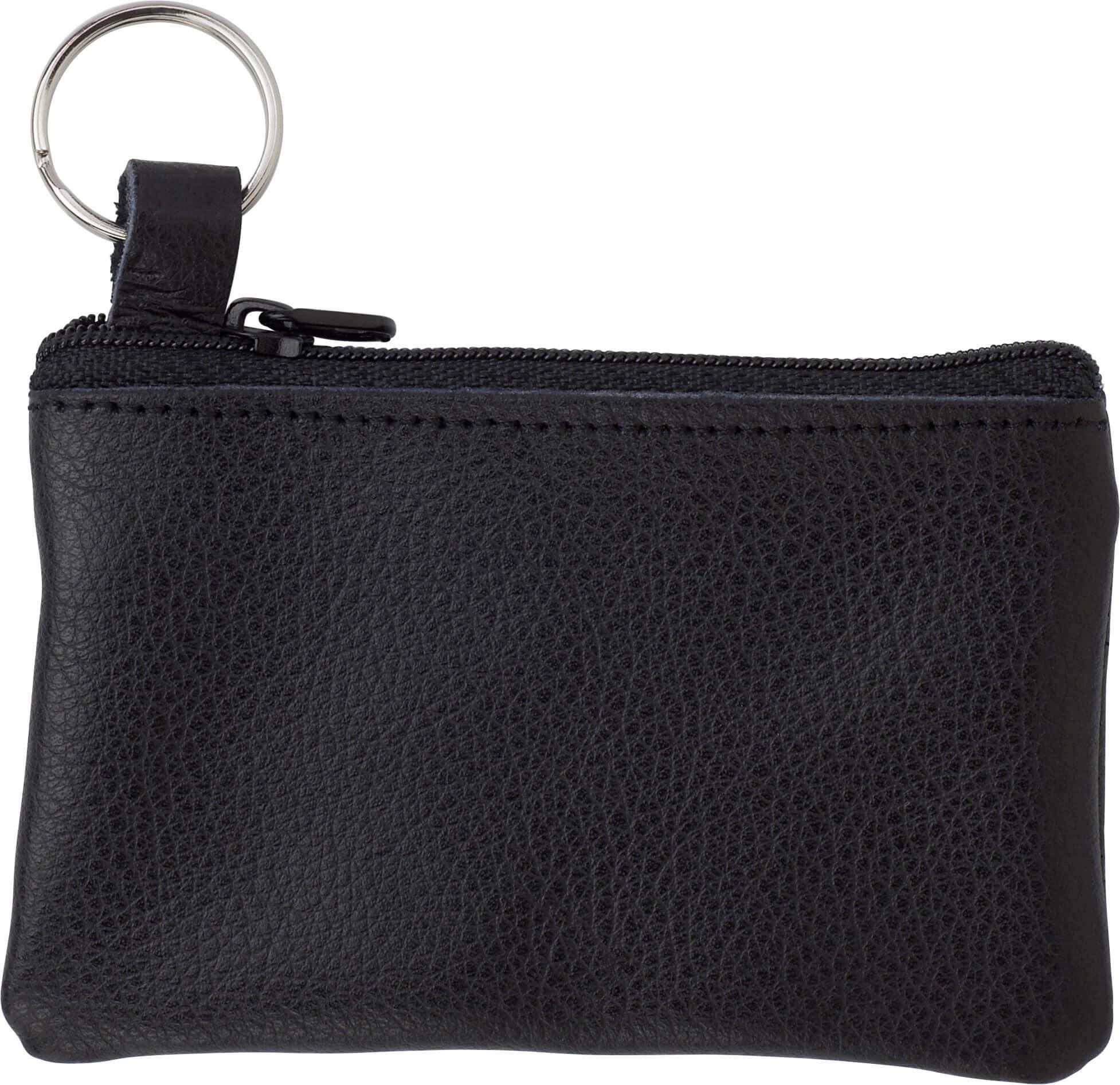 Porta-moedas de couro com fecho de correr e porta-chave com anel de metálico