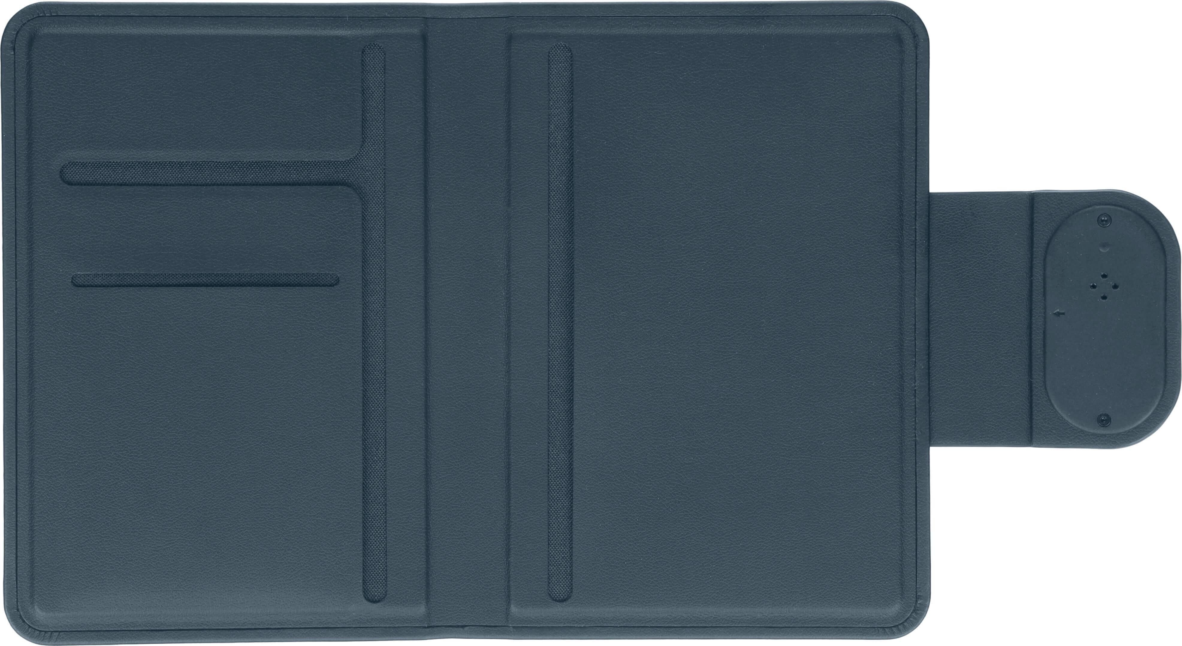 Porta-passaporte de capa dura com fecho magnético e localizador integrado compatível com Apple FindMy e Android FindHub, incorporado na aba. Possui três compartimentos internos para documentos e cartões. Fabricado em PU reciclado para um desempenho durável e flexível. Embalado numa caixa de papel kraft.