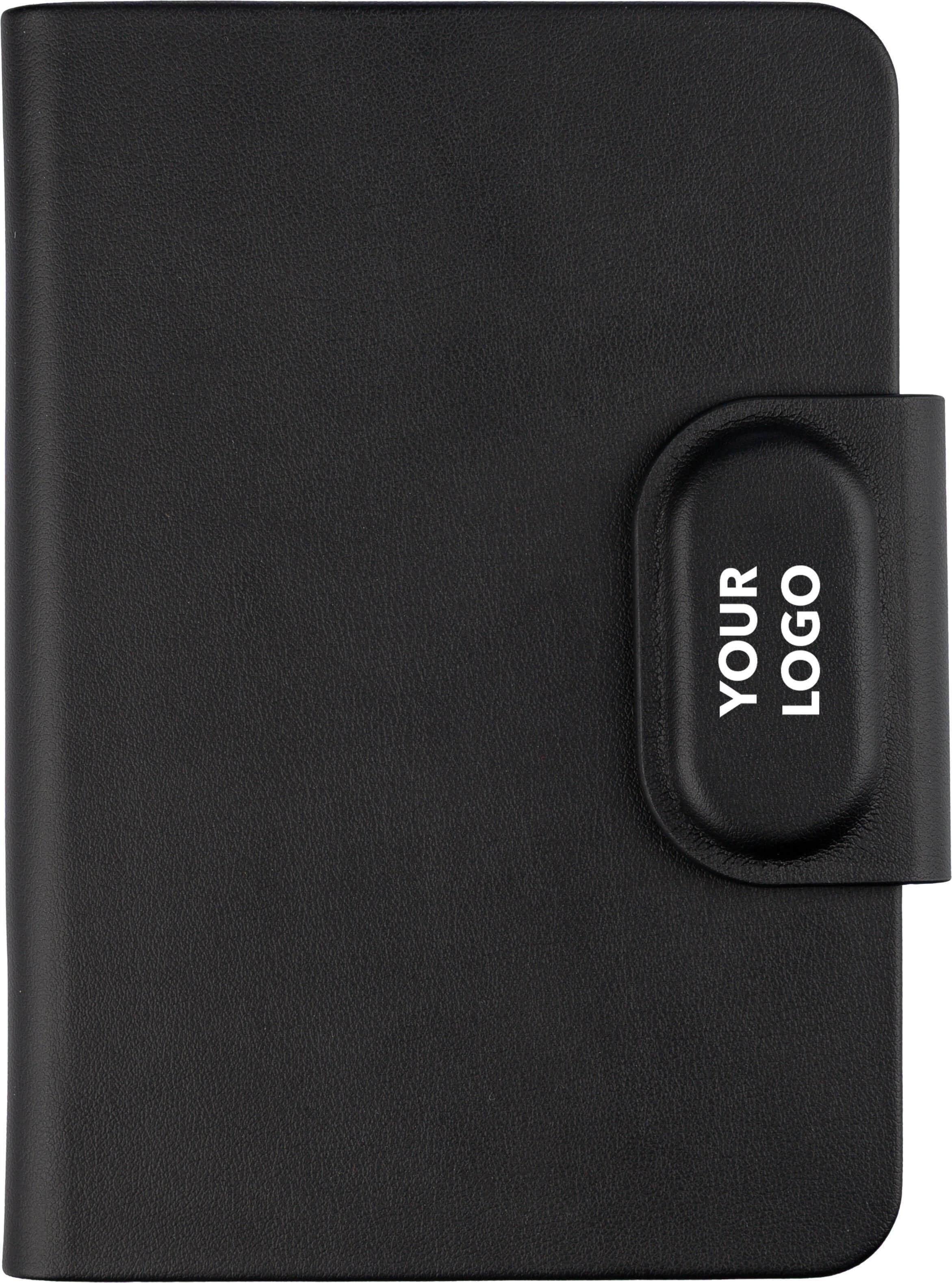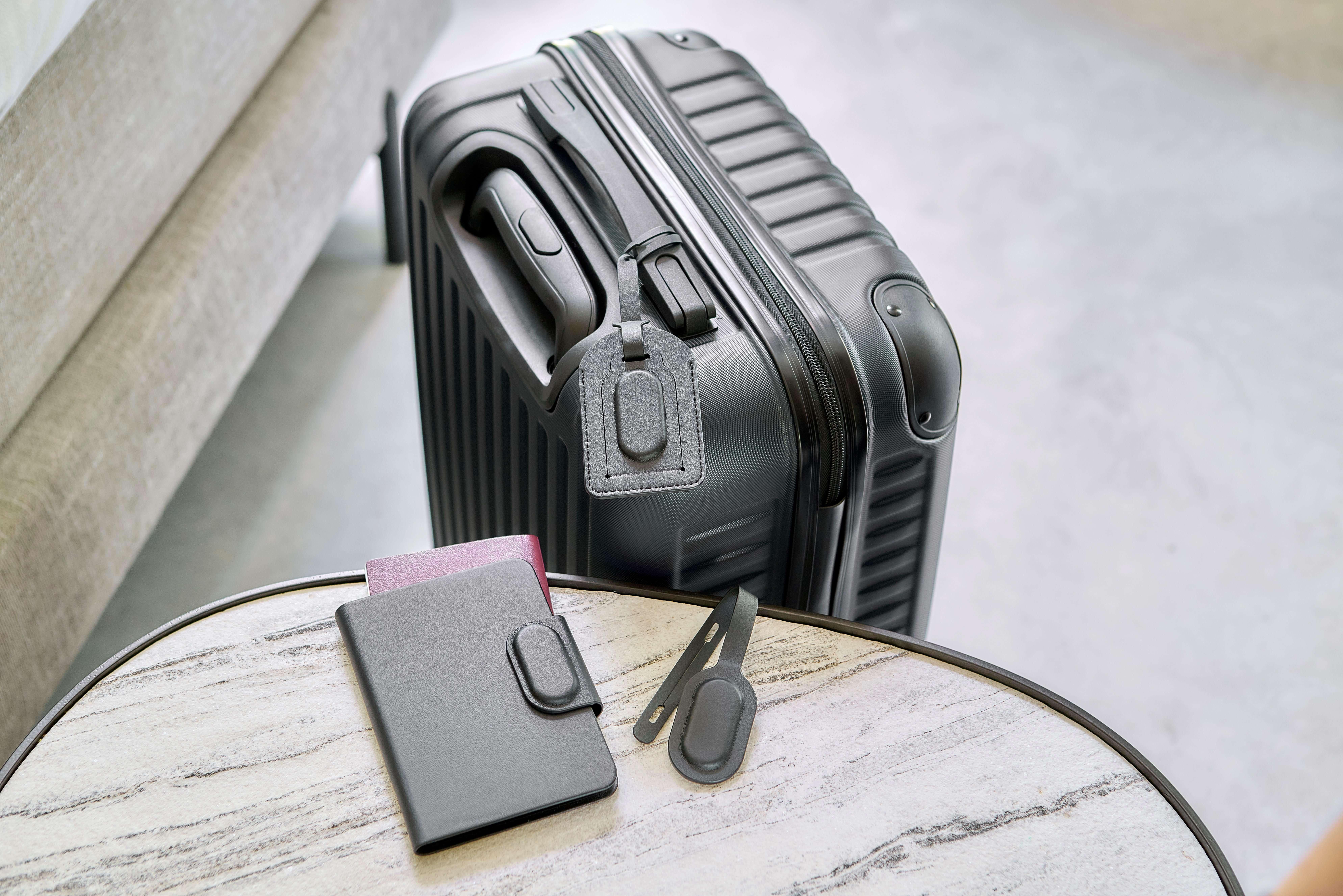 Porta-passaportes em PU reciclado de capa dura com fecho magnético e localizador Apple FindMy incorporado na aba. Inclui três compartimentos internos para organizar documentos e cartões. Utiliza “Impression” como nome do dispositivo e inclui o logótipo Impression para registo de ID. Embalado individualmente numa caixa de papel kraft.