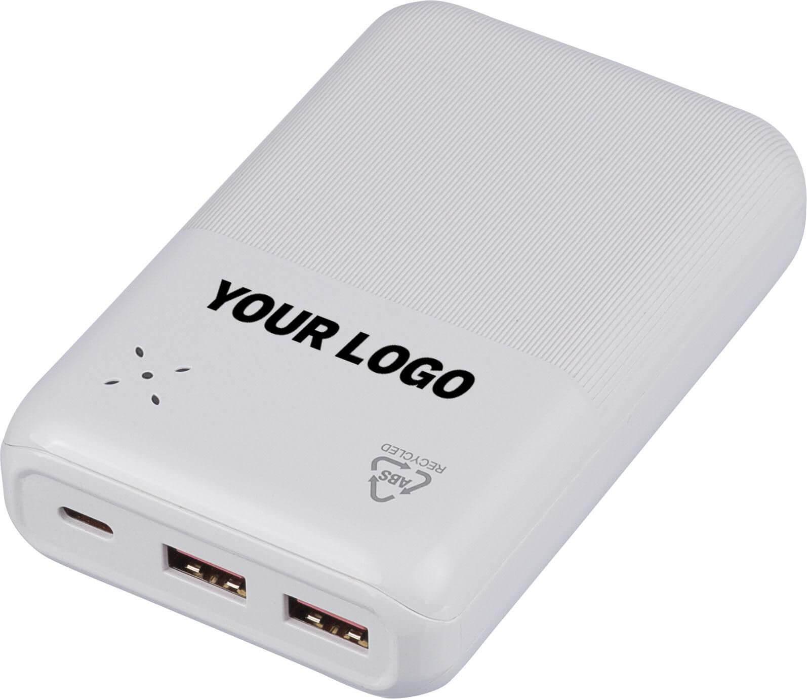Powerbank em ABS reciclado com bateria de iões de lítio de 20 000 mAh e carregamento rápido de 22,5 W. Possui entrada e saída Type-C, entrada Type-A e um indicador LED para o estado da bateria. Equipado com proteção contra sobreaquecimento, curto-circuito, sobretensão e sobrecorrente. Inclui etiqueta na parte de trás com o logótipo ABS reciclado. Embalado individualmente numa caixa de cartão castanho com papel de seda no interior.