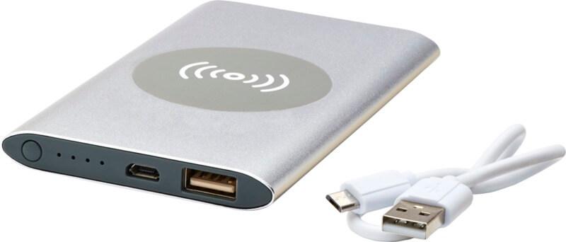 Powerbank de 4000mAh com caixa de alumínio. Suporta carregamento sem fio de 5W e também vem com saída Micro USB para permitir o carregamento por cabo. Com a bateria de polímero de lítio de 4000 mAh, pode carregar totalmente um smartphone. Indicador de energia que mostra o nível de energia a qualquer momento. Porta Micro USB: Saída 5V/2A: 5V/2A. Saída sem fios 5W. Incluindo cabo de carregamento de plástico TPE sem PVC. Fornecido numa caixa de presente padrão.
