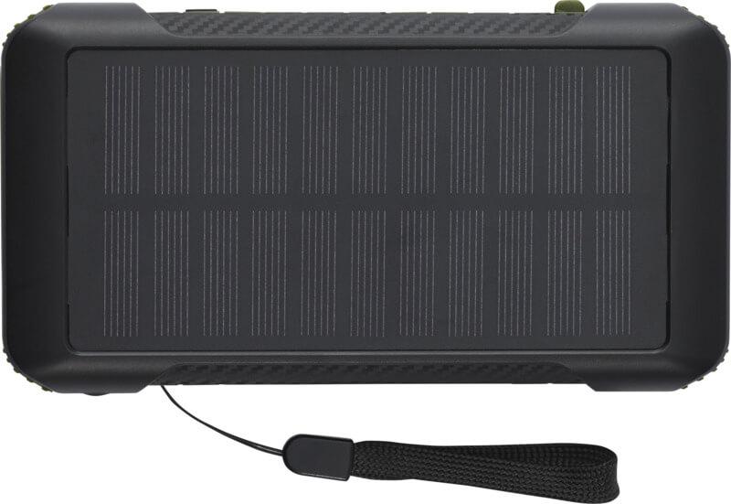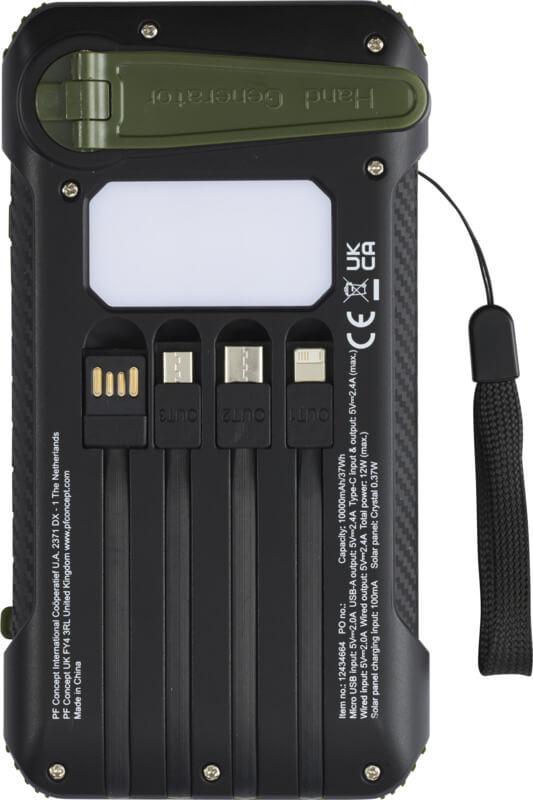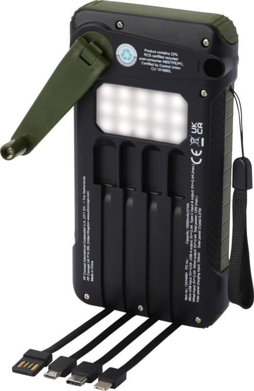 A powerbank solar de 10.000 mAh em plástico reciclado RCS “Soldy” é a companheira de carregamento ideal para atividades ao ar livre. Está equipada com um dínamo de manivela portátil para gerar energia manualmente no caso de ficar sem energia e não haver luz solar. A powerbank pode também ser carregada através das portas Tipo C ou micro USB do dispositivo. Graças aos cabos de carregamento integrados com conectores Tipo C, iOS, USB-A e micro USB, esta powerbank permite carregar a maioria dos telemóveis, câmeras, powerbanks, auriculares, etc. A powerbank tem uma potência de saída máxima de 2,4 A por porta. A potência de entrada é limitada a 2 A. Fornecida com manual de utilizador e cabo de carregamento USB-A para Tipo C de 30 cm e tudo embalado numa caixa de papel kraft 100 % reciclado.