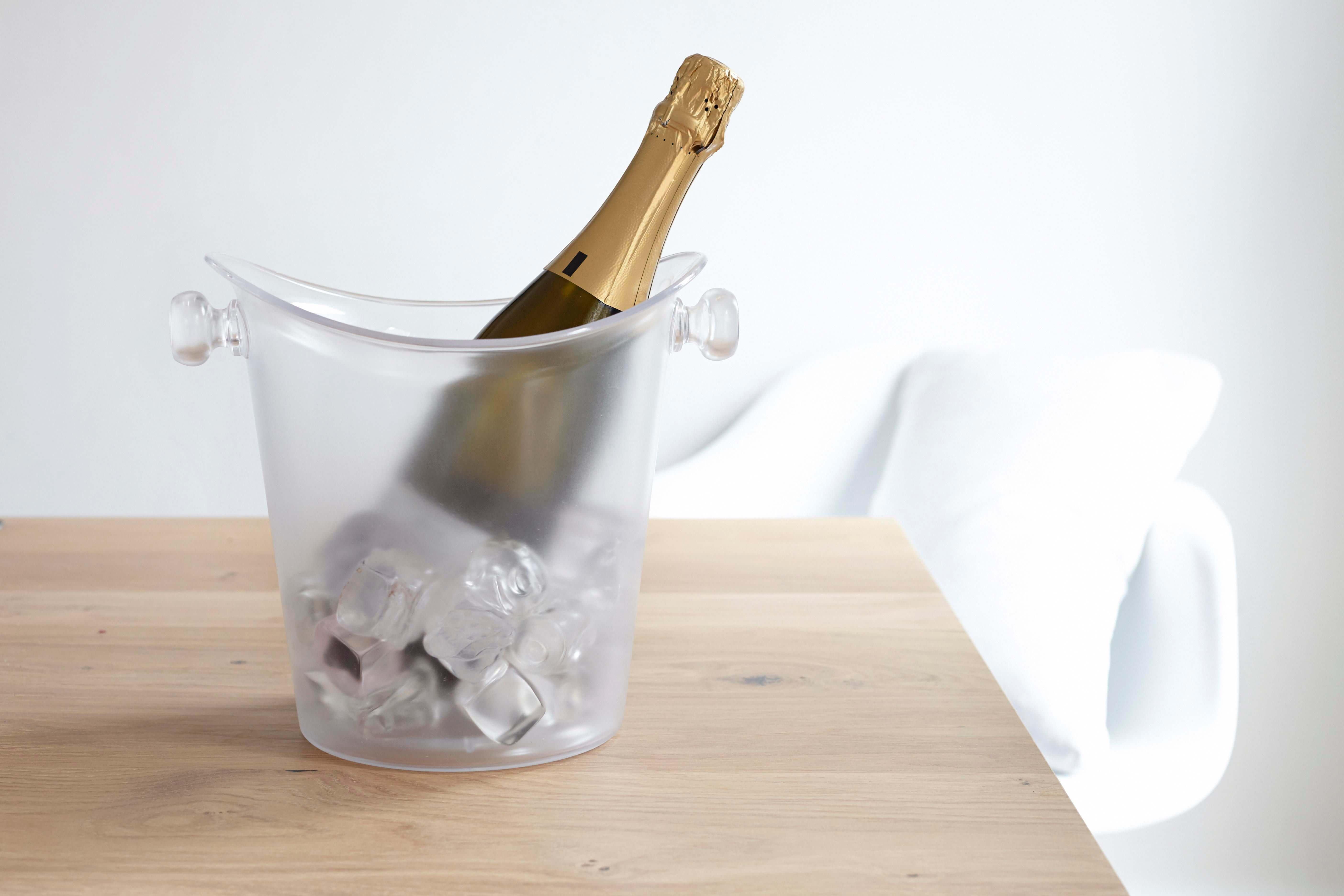 Balde para champanhe em plástico transparente.