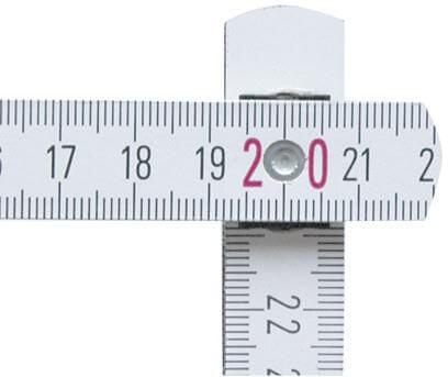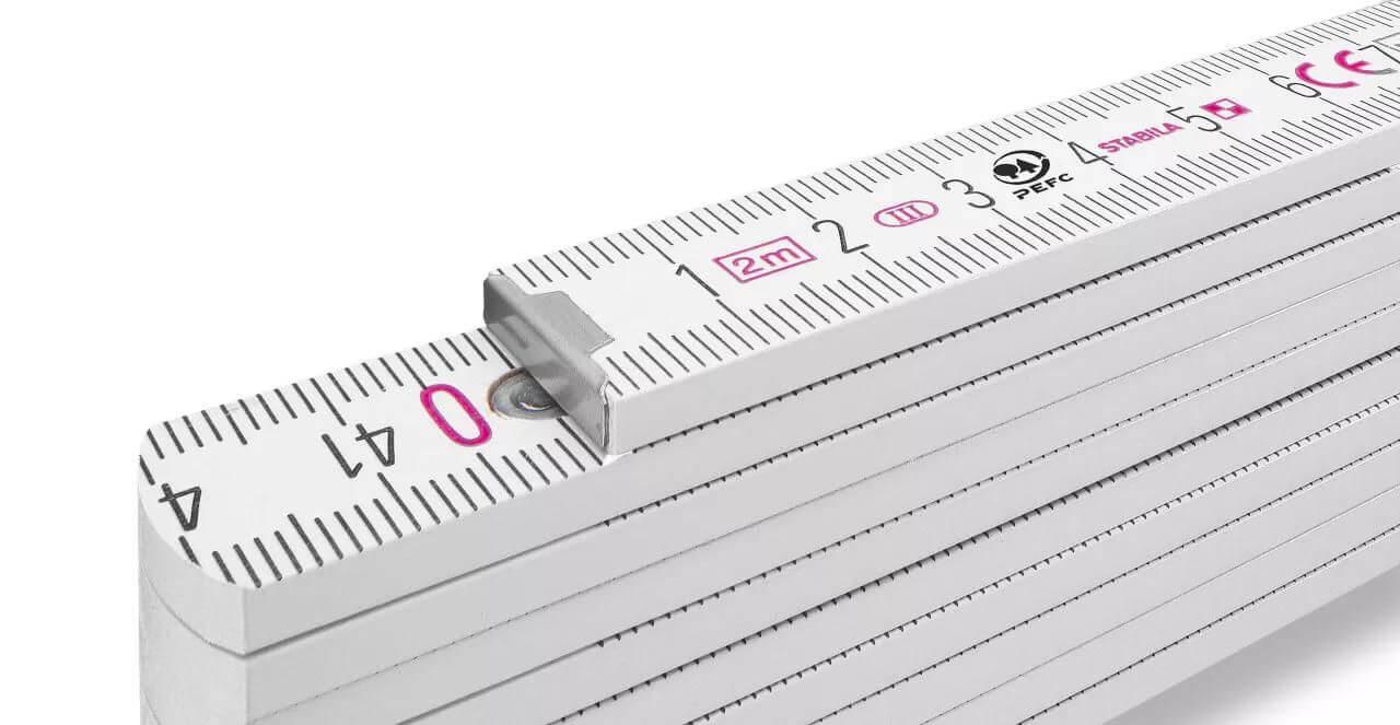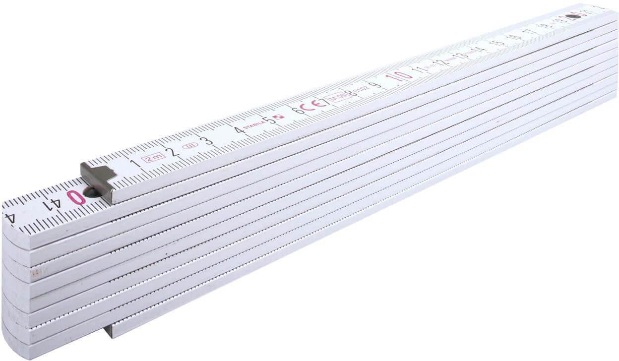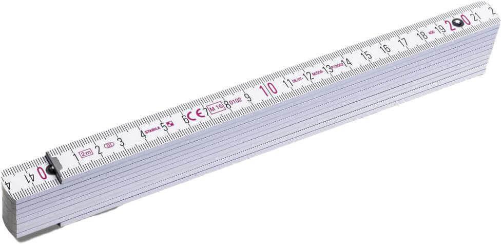 Régua de madeira Stabila dobrável com um comprimento total de 2 metros. A escala está em cm. A régua tem um revestimento resistente ao impacto e dobradiças de aço inoxidável extra fortes. Com esquema de ângulos integrado. Certificado PEFC, classe de precisão 3.