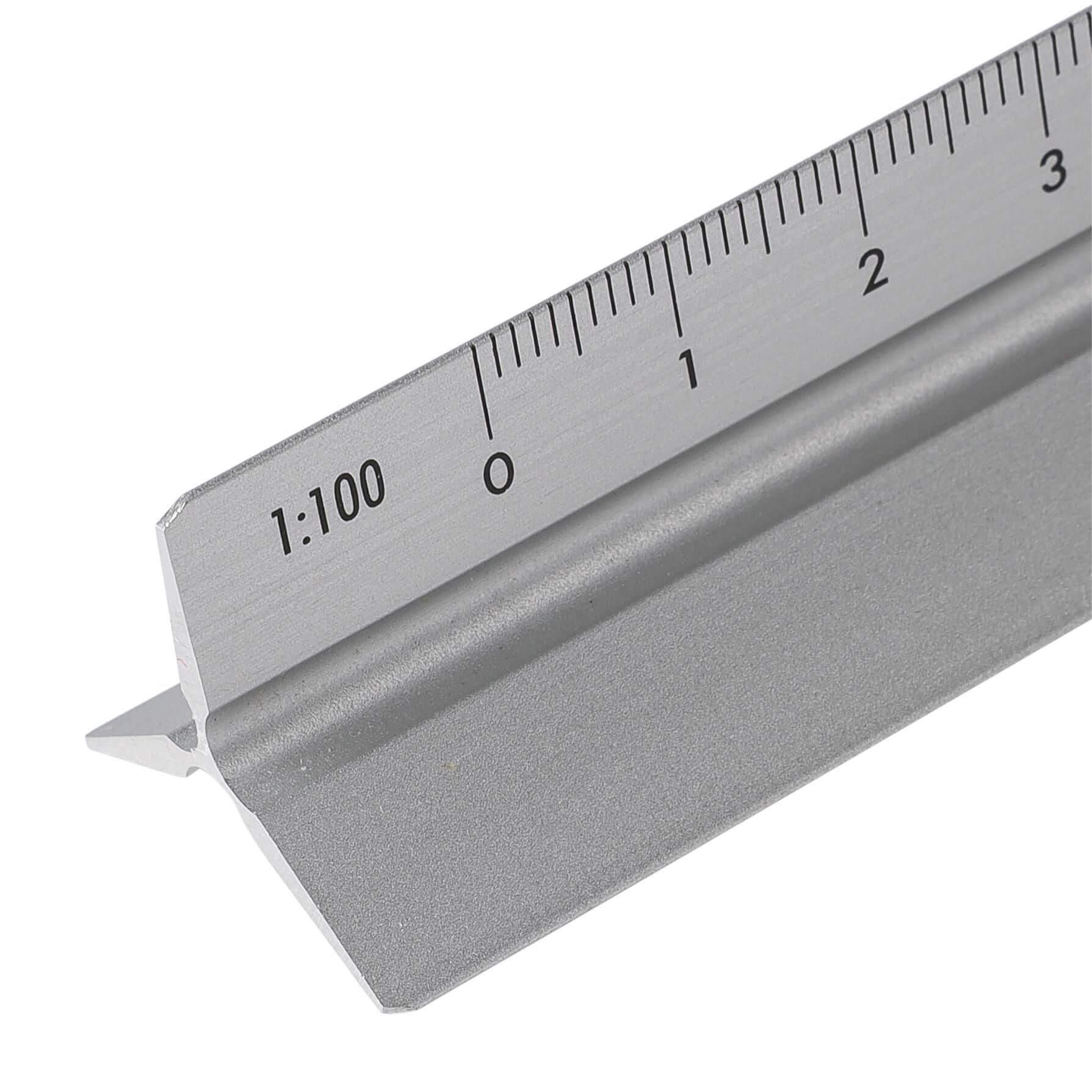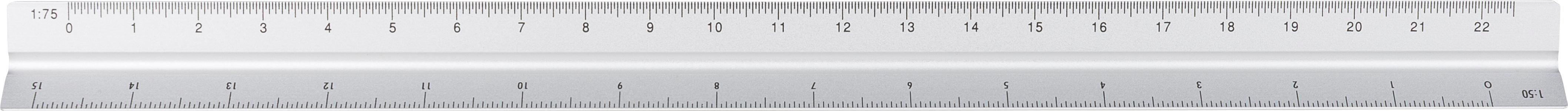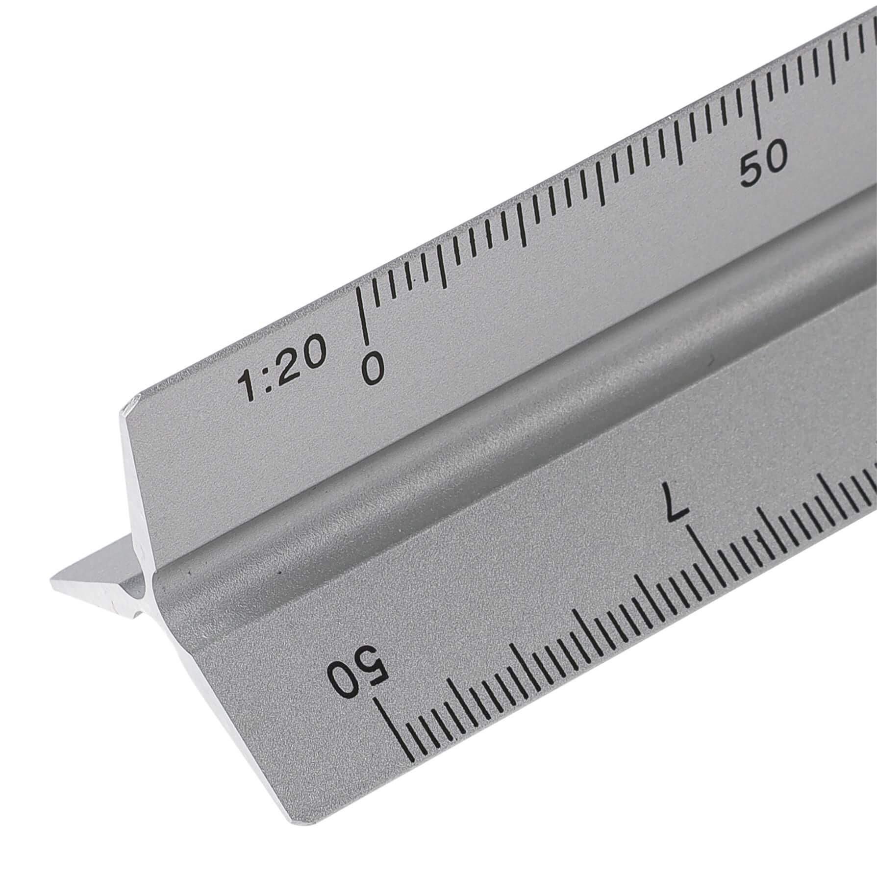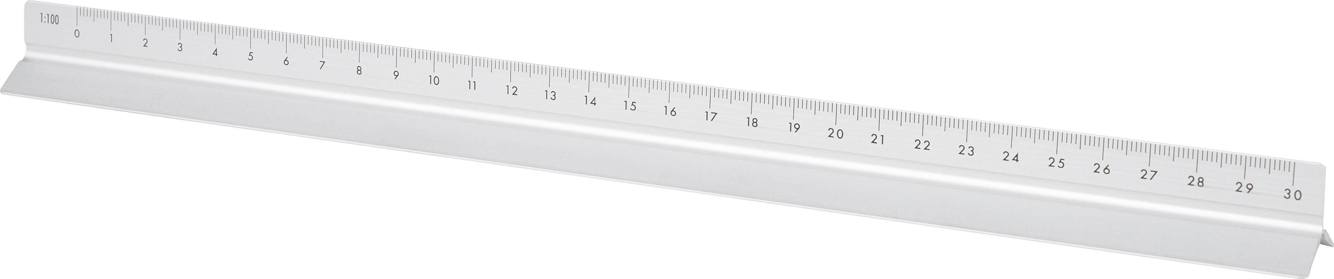 Régua triangular de alumínio com 30 cm e várias escalas de medição: 1:20, 1:25, 1:50, 1:75 e 1:100. Um dos lados sem escala para gravação. Inclui marcações em centímetros e polegadas. Embalada individualmente numa caixa de cartão castanho.