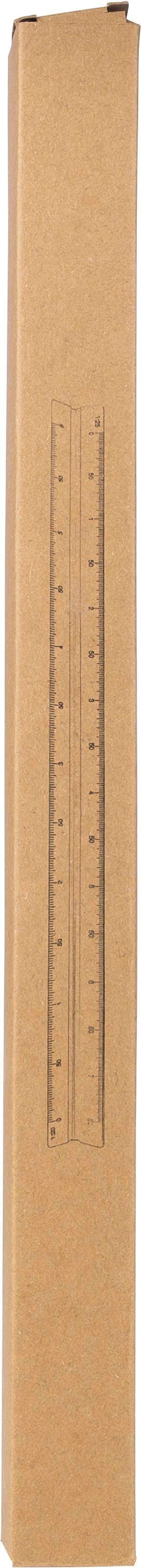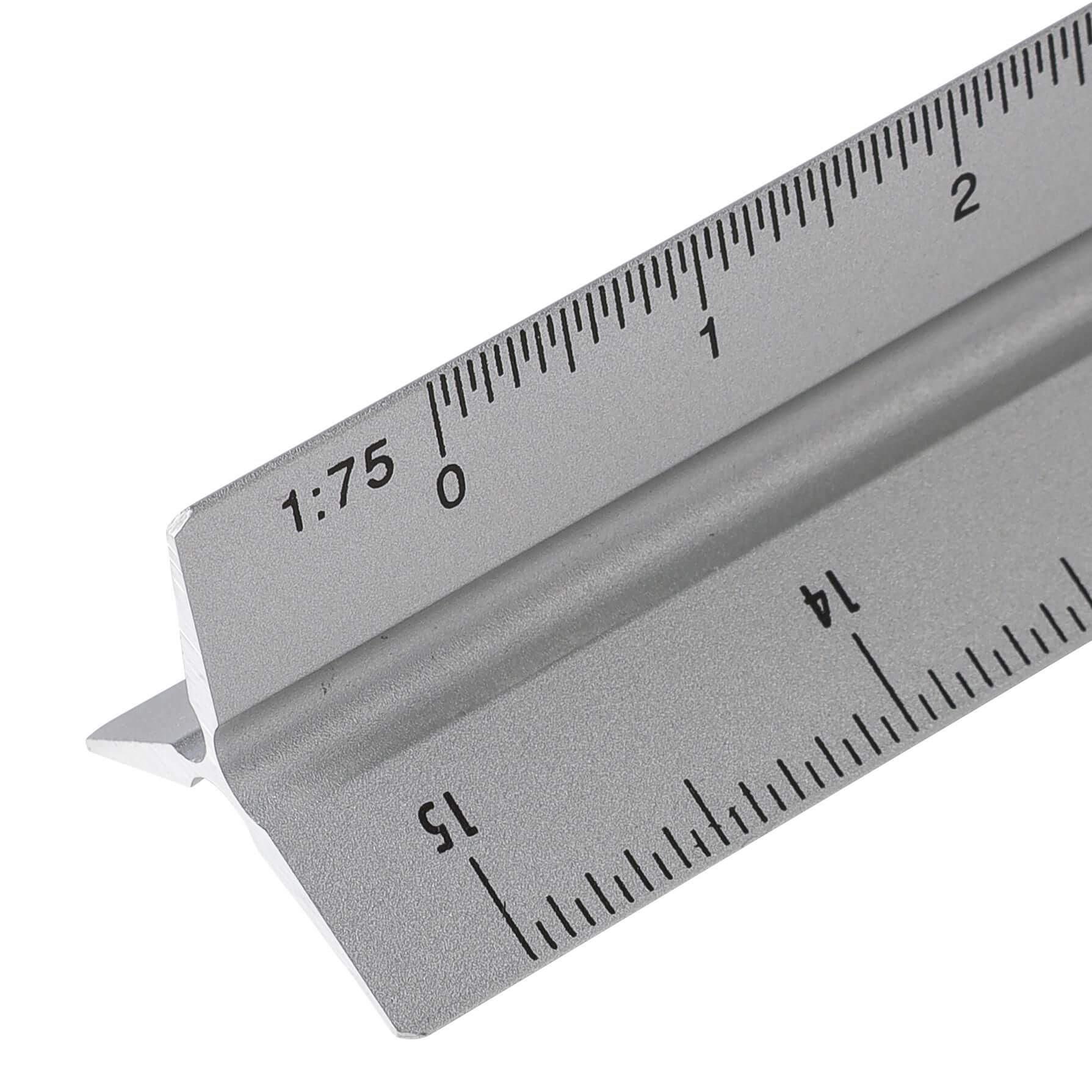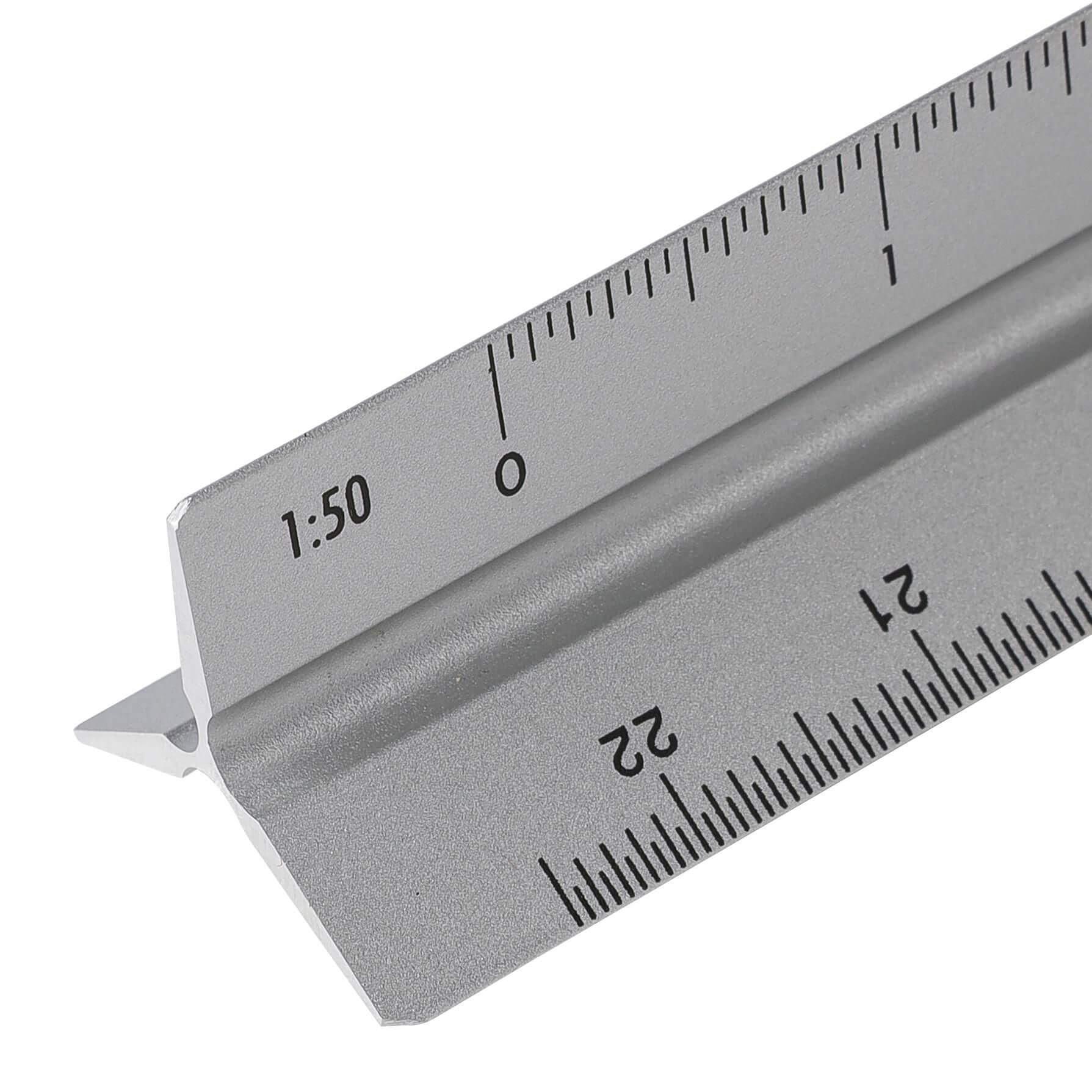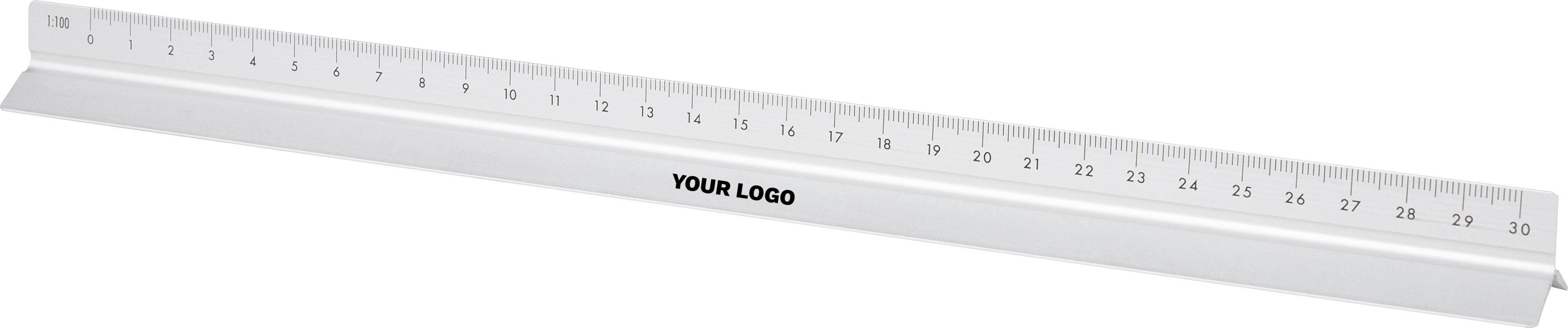 Régua triangular de alumínio com 30 cm e várias escalas de medição: 1:20, 1:25, 1:50, 1:75 e 1:100. Um dos lados sem escala para gravação. Inclui marcações em centímetros e polegadas. Embalada individualmente numa caixa de cartão castanho.
