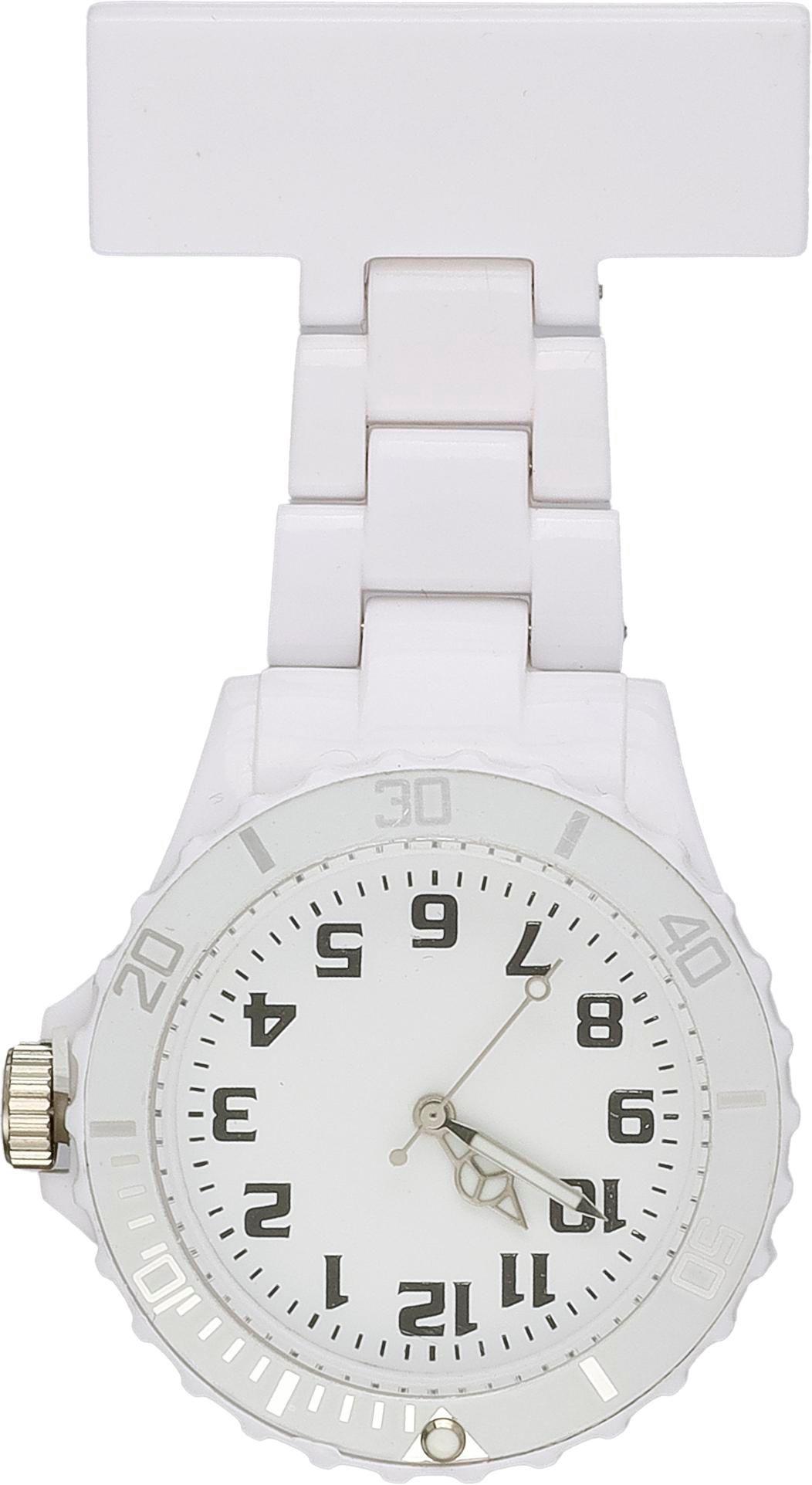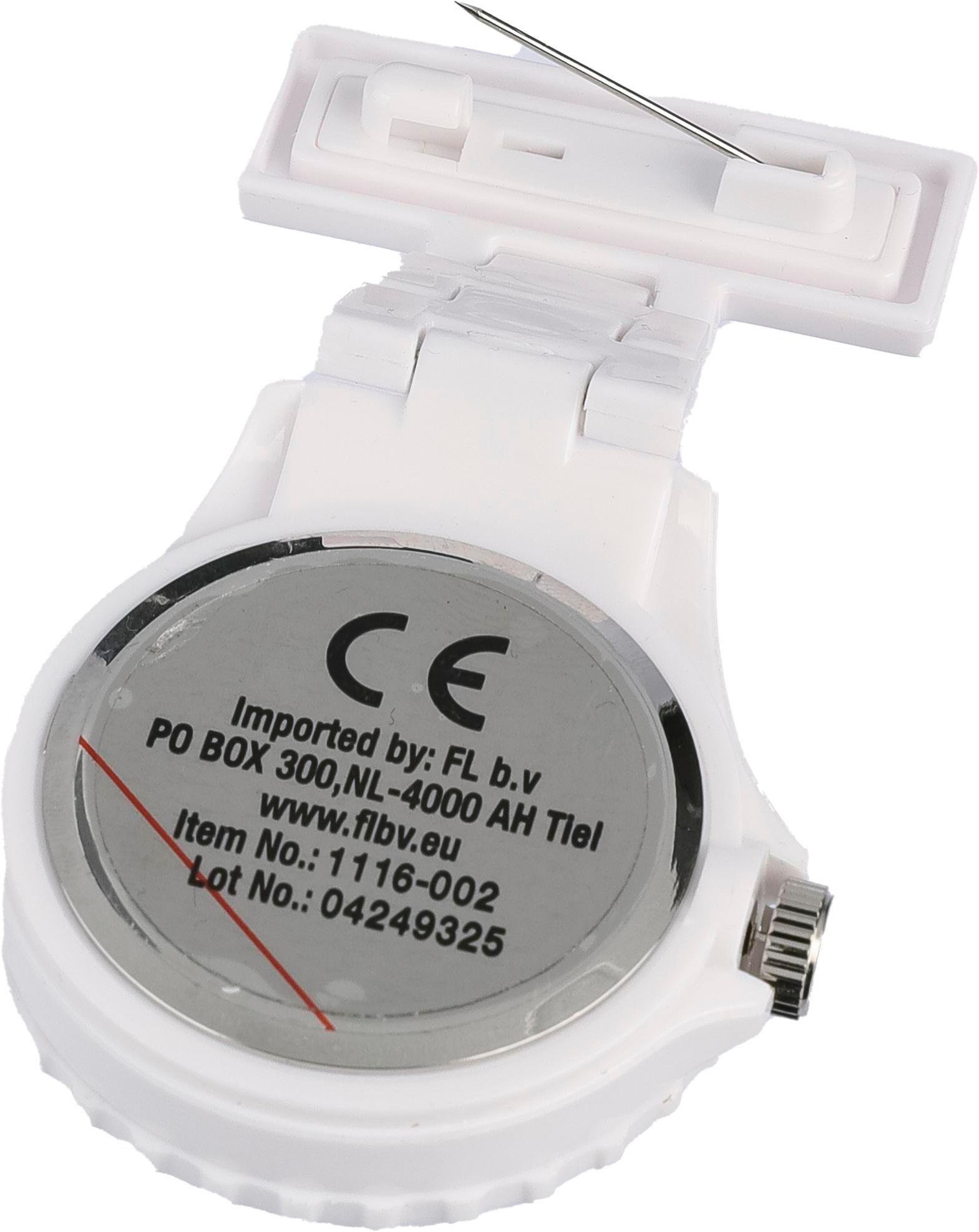 Relógio de enfermeira com digitos prateados e brancos na banda e esfera, com uma placa retângular com fecho de segurança.