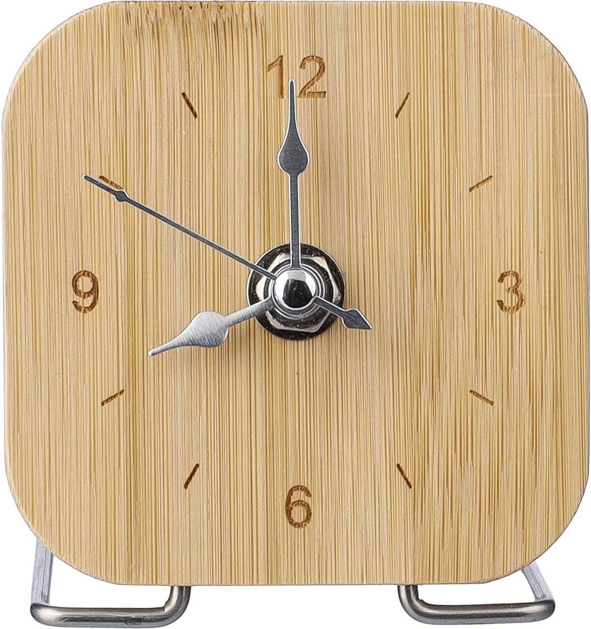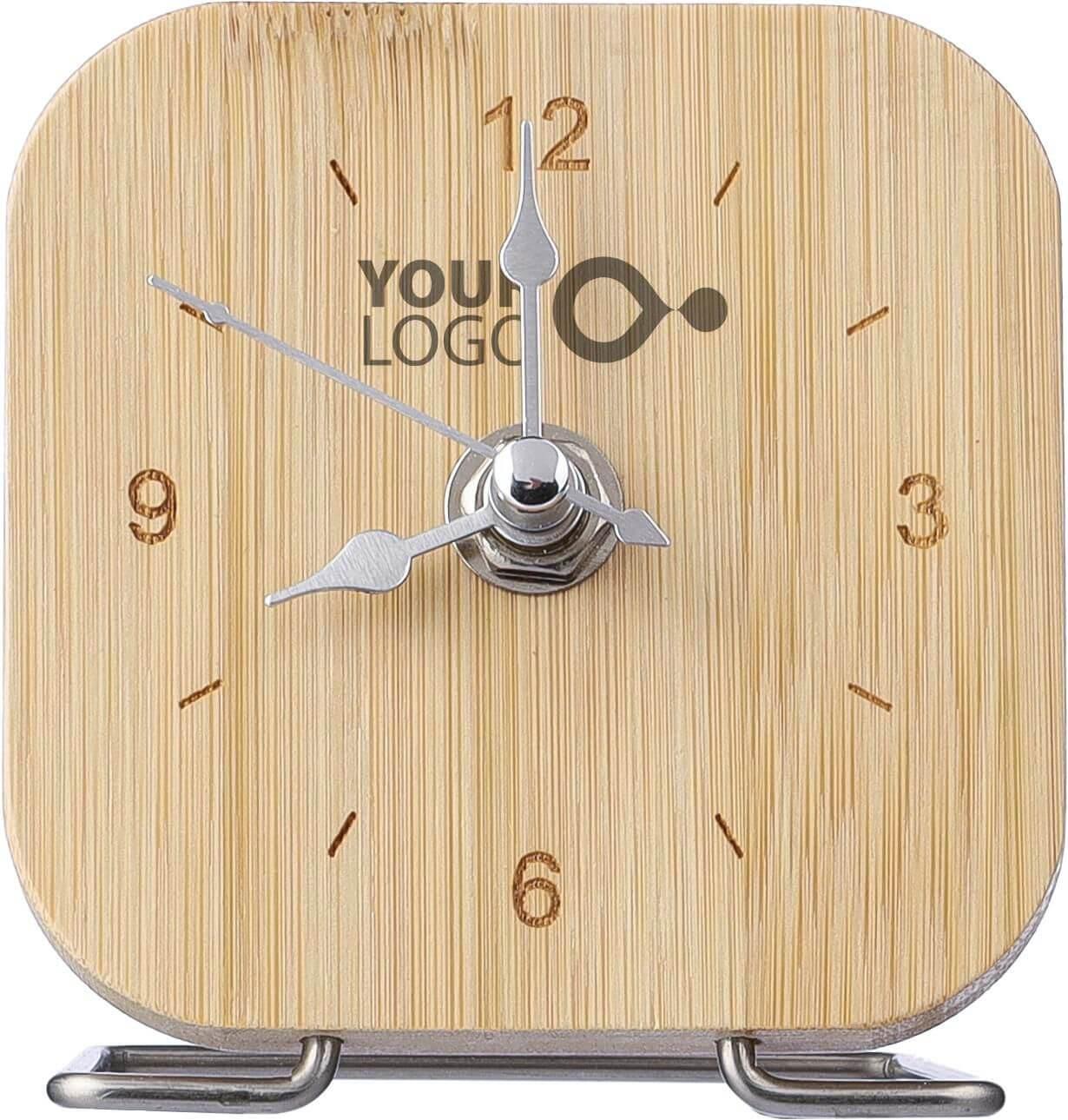 Relógio de bambu com ponteiros prateados e suporte. Pilha incluída. Apresentado individualmente numa caixa de cartão castanha.