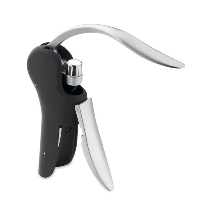 Saca-rolhas de alavanca automático em ABS e acabamento em borracha.