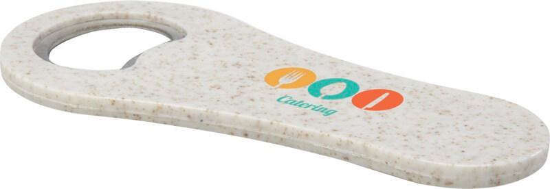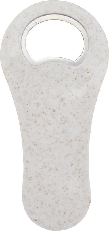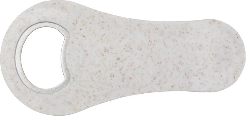 Abre garrafas feito de palha de trigo para abrir garrafas de cerveja, refrigerantes, etc. A palha de trigo são os talos que sobram após a colheita dos grãos de trigo, o que reduz a quantidade de plástico utilizado.