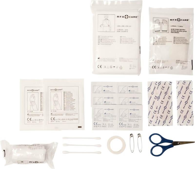 Saco impermeável de lona resistente e durável com 30 peças de material de primeiros socorros. O kit contém uma tesoura (9 cm), 1 bandagem elástica (4 metros x 6 cm), 2 cotonetes secos (5×5 cm), 6 cotonetes para limpeza da pele, 1 ligadura triangular (136x96x96 cm), 1 fita adesiva (1,25 cm x 5 metros), 1 par de luvas (5,5 g), 3 alfinetes de algodão (8 cm), 2 alfinetes de segurança (3,6 cm) e 12 pensos (7,2×1,9 cm). O fecho com fivela de plástico garante que o conteúdo é mantido seco e seguro. Ótimo para desportos aquáticos e outras atividades ao ar livre. Os kits de primeiros socorros irão ajudá-lo a realizar um tratamento simples da ferida, para reduzir as lesões secundárias. Um kit de primeiros socorros é considerado um dispositivo médico e é regido pela Diretiva 93/42/CEE, com base na utilização prevista: “diagnóstico, prevenção, monitorização, tratamento ou alívio de doenças”. Este dispositivo médico pertence à CLASSE I, Is.