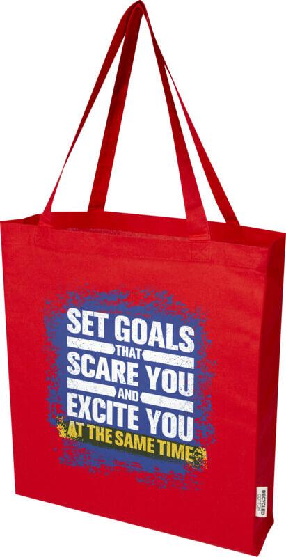 O saco com base “Madras” 100% de algodão reciclado com certificado GRS é o saco de oferta perfeito para qualquer evento ou conferência, ou para usar como saco para pequenas compras. A densidade de algodão de 140 g/m² torna o saco resistente, durável e adequado para transportar itens pesados no compartimento principal. Com as alças de ombro de 30 cm de comprimento, este saco é fácil de transportar. Os métodos de impressão disponíveis para este saco também são certificados, garantindo que toda a cadeia de fornecimento seja transparente e certificada. Fabricado na Índia. Resistência até 5 kg de peso.