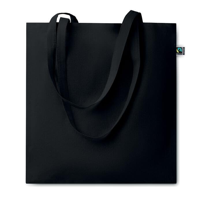 Sacola de compras de algodão tingido de comércio justo com alças longas. 140gr/m². Este produto tem a certificação OEKO-TEX® STANDARD 100.