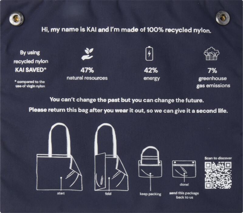 O “Kai” saco circular reciclado GRS – o maior impacto positivo em termos de desempenho ambiental. Uma exploração mais sustentável começa com um design melhor – um design com menos impacto no ambiente. A redução média total do impacto já obtida com 1 saco é a seguinte: 7% de pegada de carbono, 42% de energia e 47% de custos ecológicos. Feita em nylon reciclado certificado 200T GRS, o “Kai” é um saco clássico e atemporal, adequado para uso diário. O local designado para impressão é no bolso que também funciona como bolsa. O saco pode ser devolvido por meio de um programa de devolução com um código QR que fornece informações adicionais.