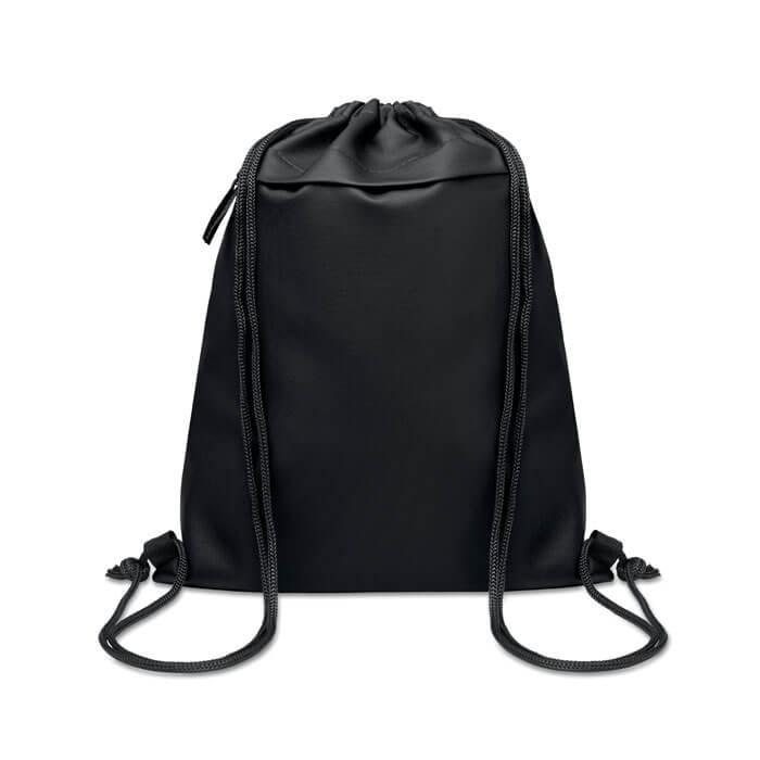 Saco com cordão com poliéster 600D RPET revestido a PU e forro em poliéster 190T RPET. Bolso frontal com fecho de correr.