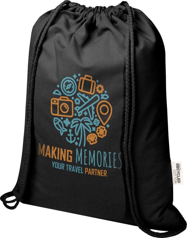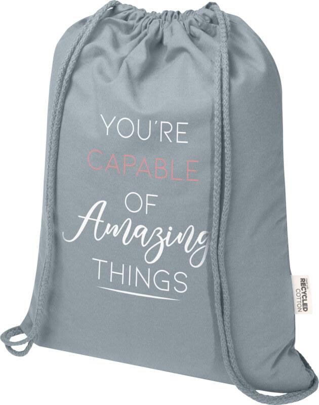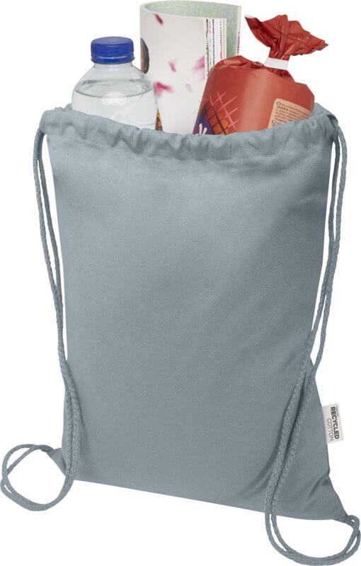 O saco com cordão “Oregon Blend” de 60 % de algodão reciclado com certificação GRS e 40 % de RPET GRS é fácil de distribuir como oferta para promover a sua marca ou campanha de marketing. Este saco leve é económico, fácil de transportar às costas ou no ombro e tem espaço suficiente para adicionar um logotipo ou outras mensagens. O cordão permite abrir e fechar facilmente e o material de algodão de 140 g/m² é forte e durável. Grande compartimento principal com fecho de cordão em algodão. Os métodos de impressão disponíveis para este saco também são certificados pela GRS, garantindo que toda a cadeia de fornecimento seja transparente e certificada. Fabricado na Índia. Resistência até 5 kg de peso. Capacidade volumétrica: 5 litros.