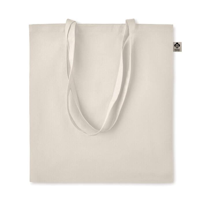 Saco de compras de algodão orgânico com alças longas. Um design clássico de sacola feito para transportar suas compras diárias ou outros itens. Carregue a bolsa nas mãos ou no ombro com as alças longas. Fabricado com 100% algodão orgânico natural 140 gr / m². Este produto tem a certificação OEKO-TEX® STANDARD 100.