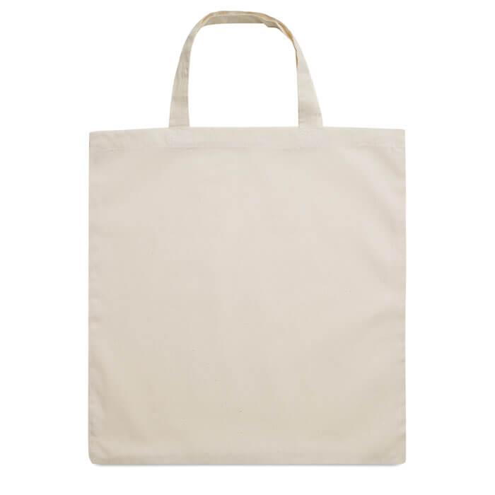 Saco de algodão com alças curtas. 140gr/m². Este produto tem a certificação OEKO-TEX® STANDARD 100.