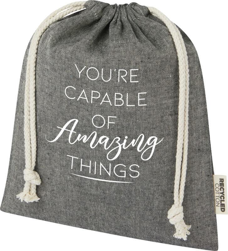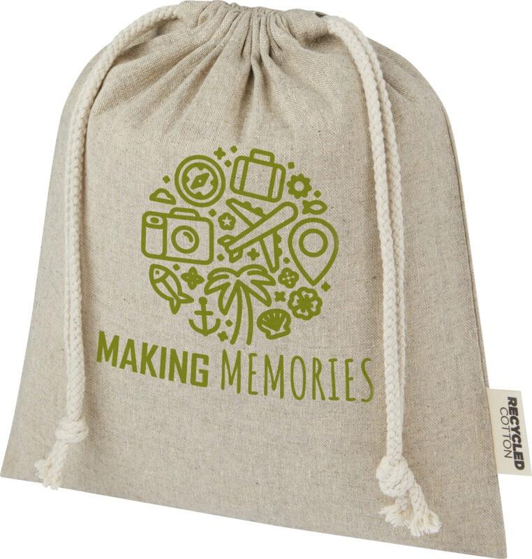 Saco de presente feito de algodão reciclado certificado GRS com fecho de cordão de algodão. Ideal para presentear ou armazenar itens. Tamanho: 25 x 30 cm. Pode haver pequenas variações na cor do produto real devido à natureza do processo de produção.