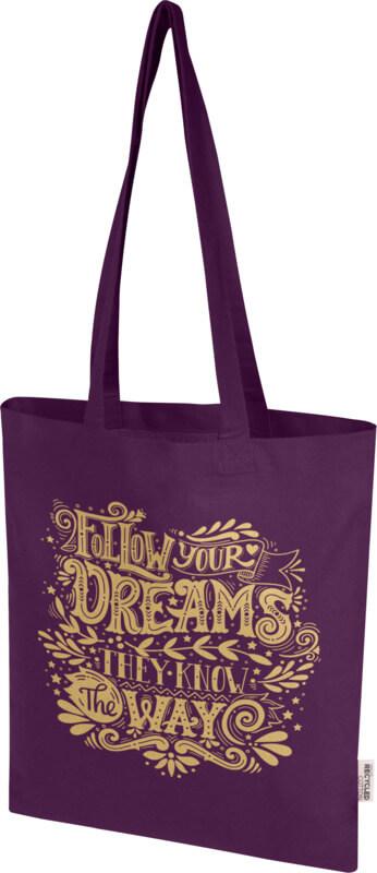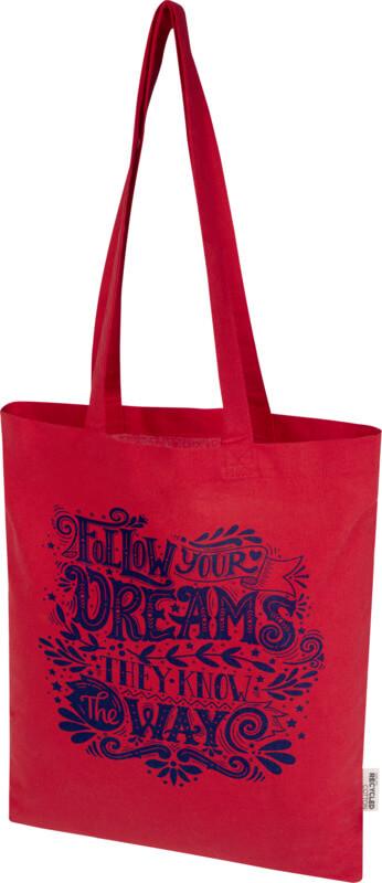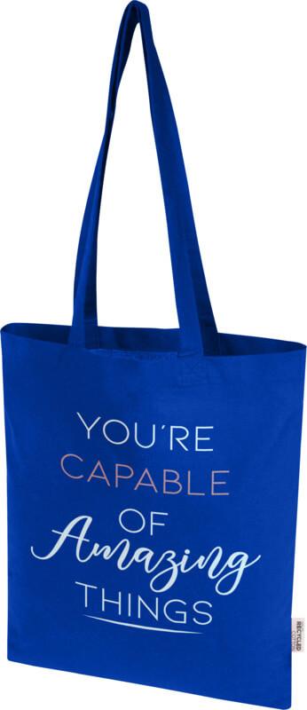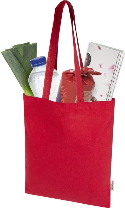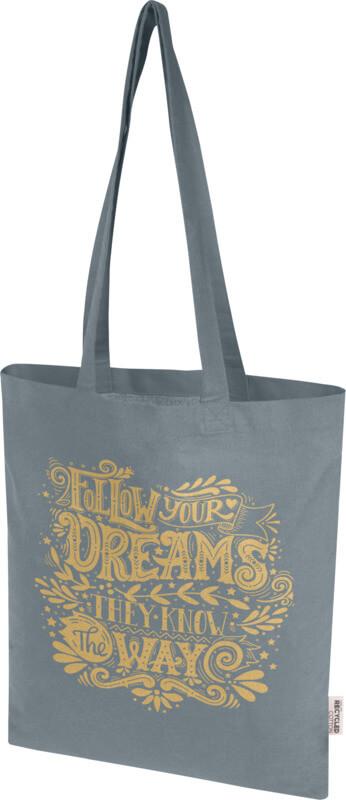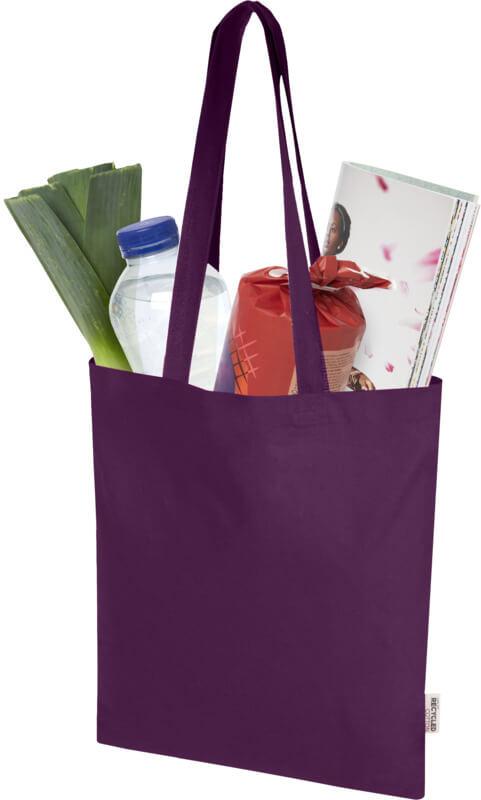 O saco “Madras Blend” de 60 % de algodão reciclado com certificação GRS e 40 % de RPET GRS é o saco perfeito para oferecer a alguém num evento, conferência ou para usar como saco de compras para pequenos mantimentos. A densidade de algodão de 140 g/m² torna o saco resistente, durável e adequado para transportar itens pesados no compartimento principal. Com as alças de ombro de 30 cm de comprimento, este saco é fácil de transportar. Os métodos de impressão disponíveis para este saco também são certificados pela GRS, garantindo que toda a cadeia de fornecimento seja transparente e certificada. Fabricado na Índia. Resistência até 5 kg de peso. Capacidade volumétrica: 7 litros.