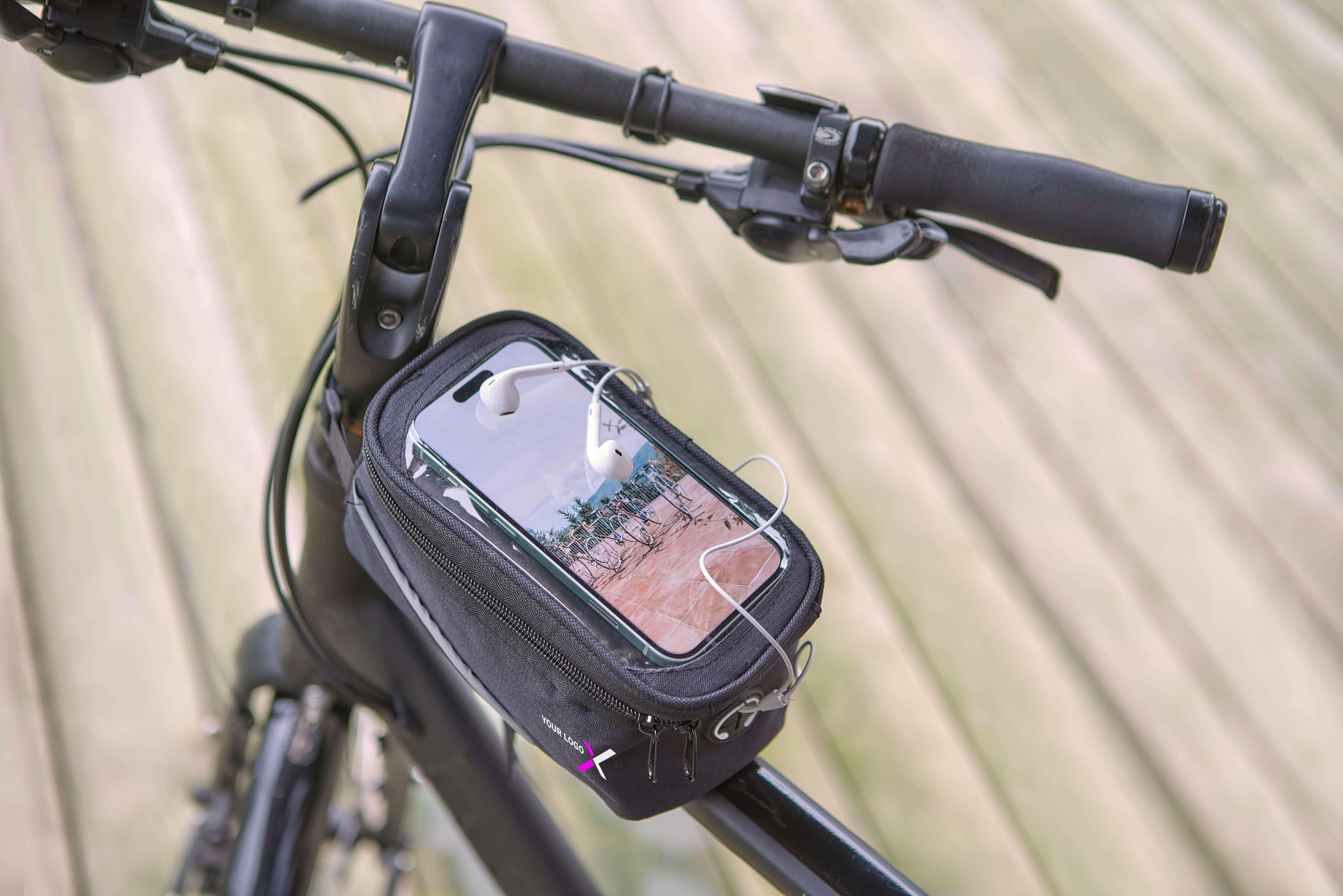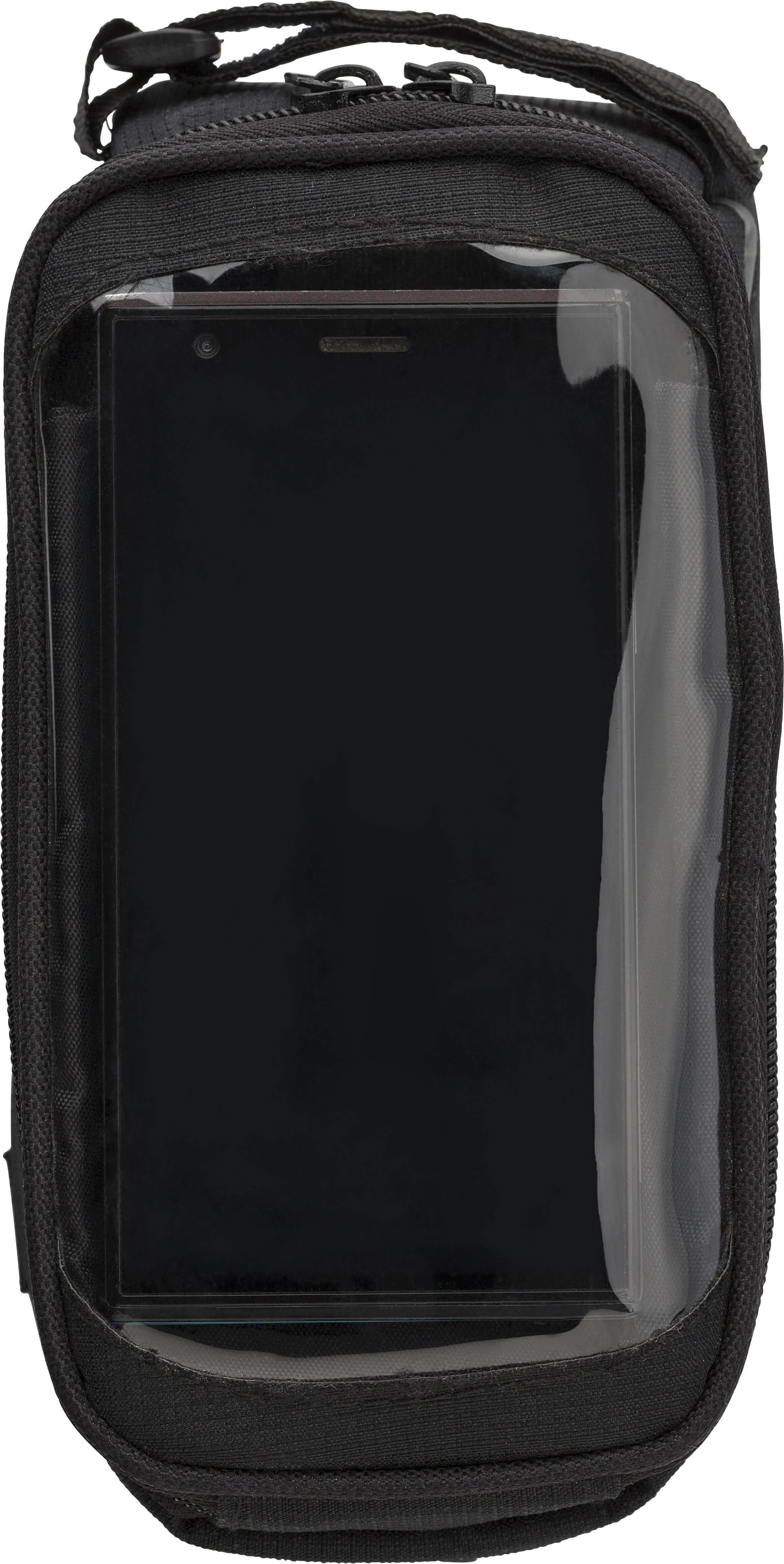 Saco de poliéster (600D) e PVC, com tiras de velcro para fixar no guiador. Faixas laterais reflectoras e abertura para o cabo dos auscultadores. Compartimento superior do telemóvel, com cobertura de ecrã táctil em PVC.