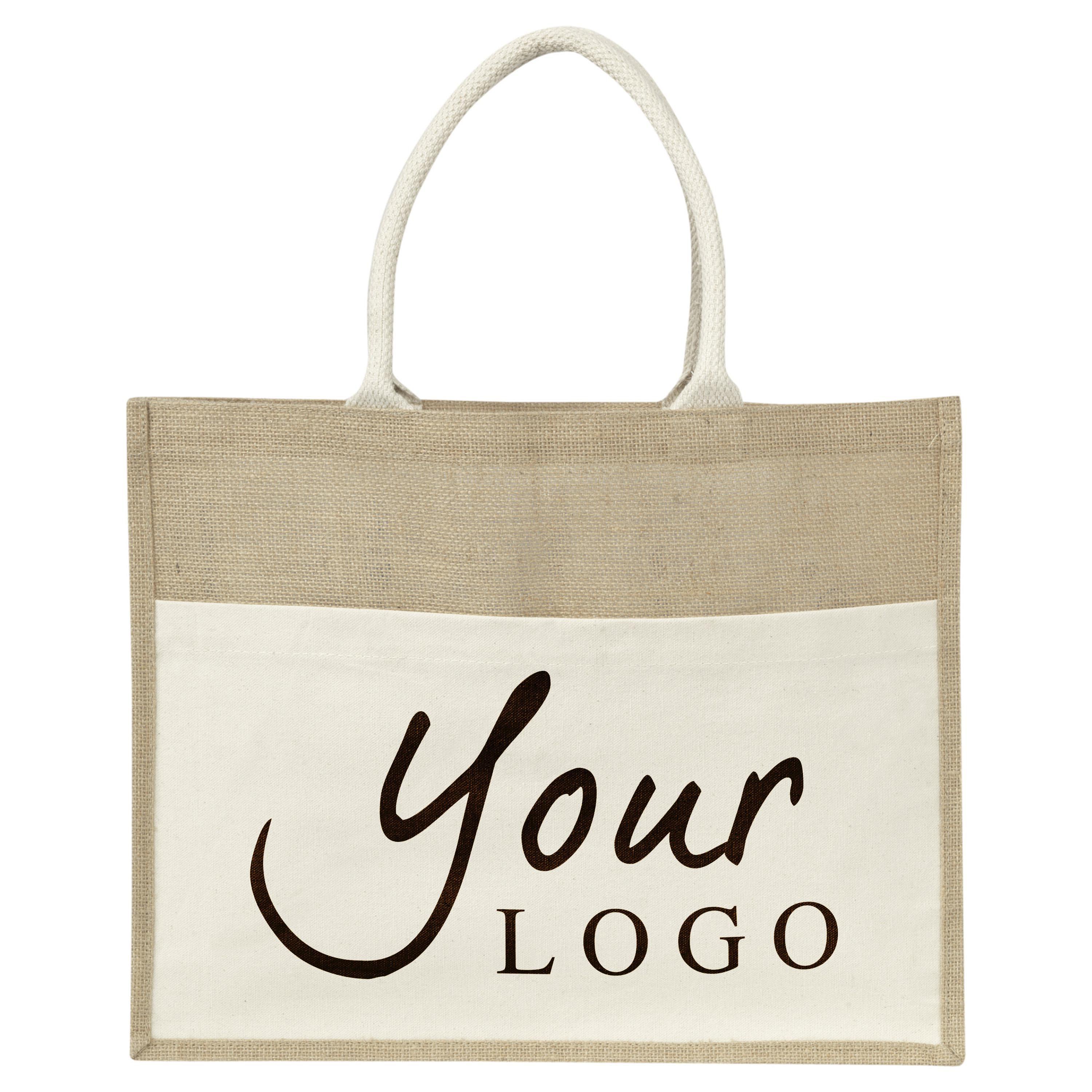 Saco de juta com interior de plástico, grande bolso frontal e pega alcochoada (1,3 x 50 cms) em algodão.