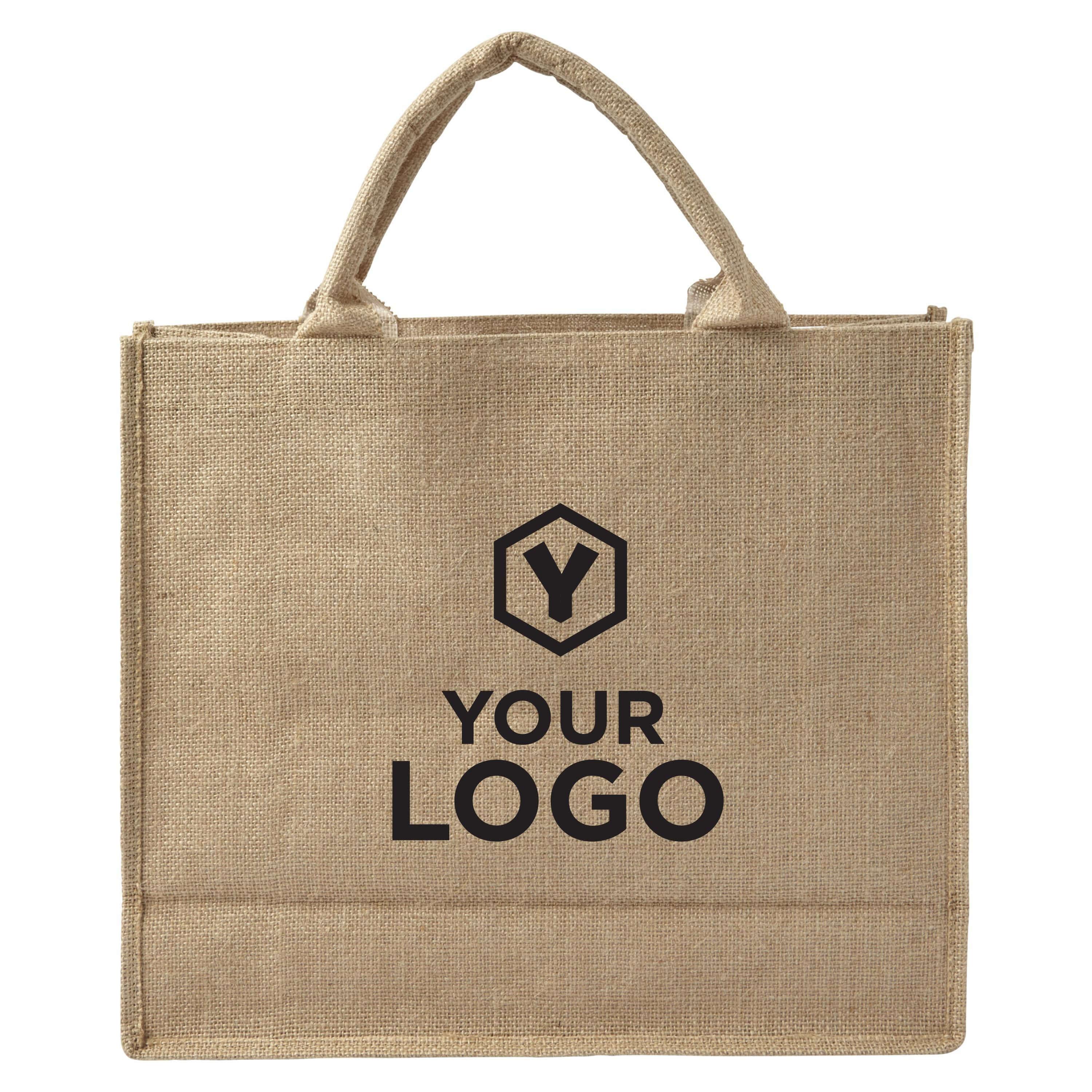 Saco de compra em juta com pegas curtas e interior laminado.