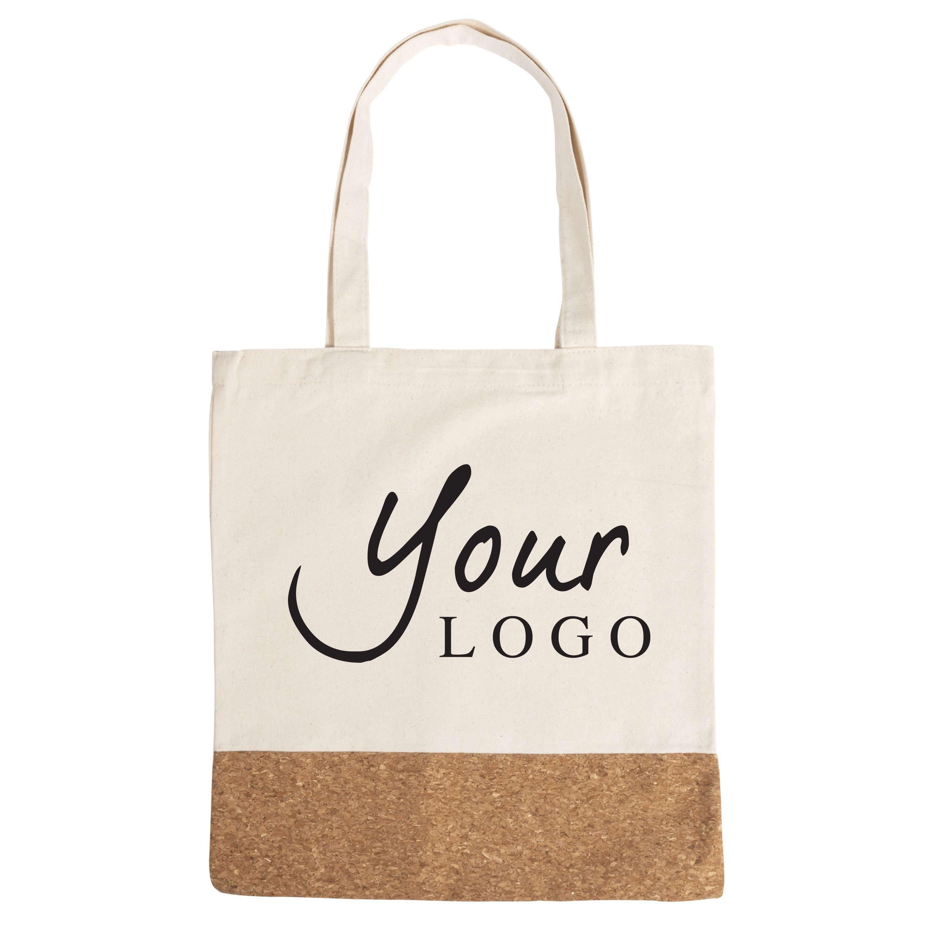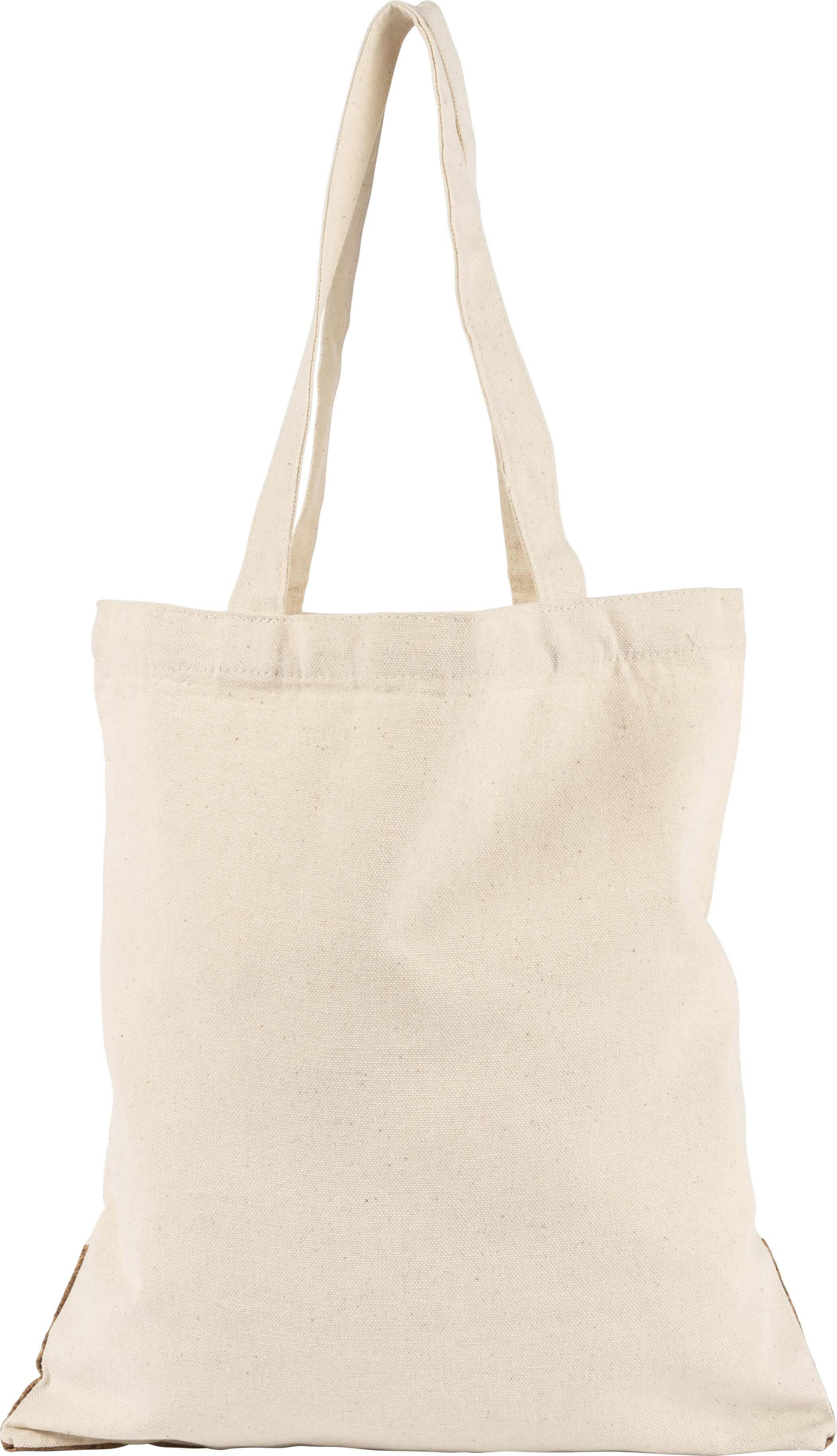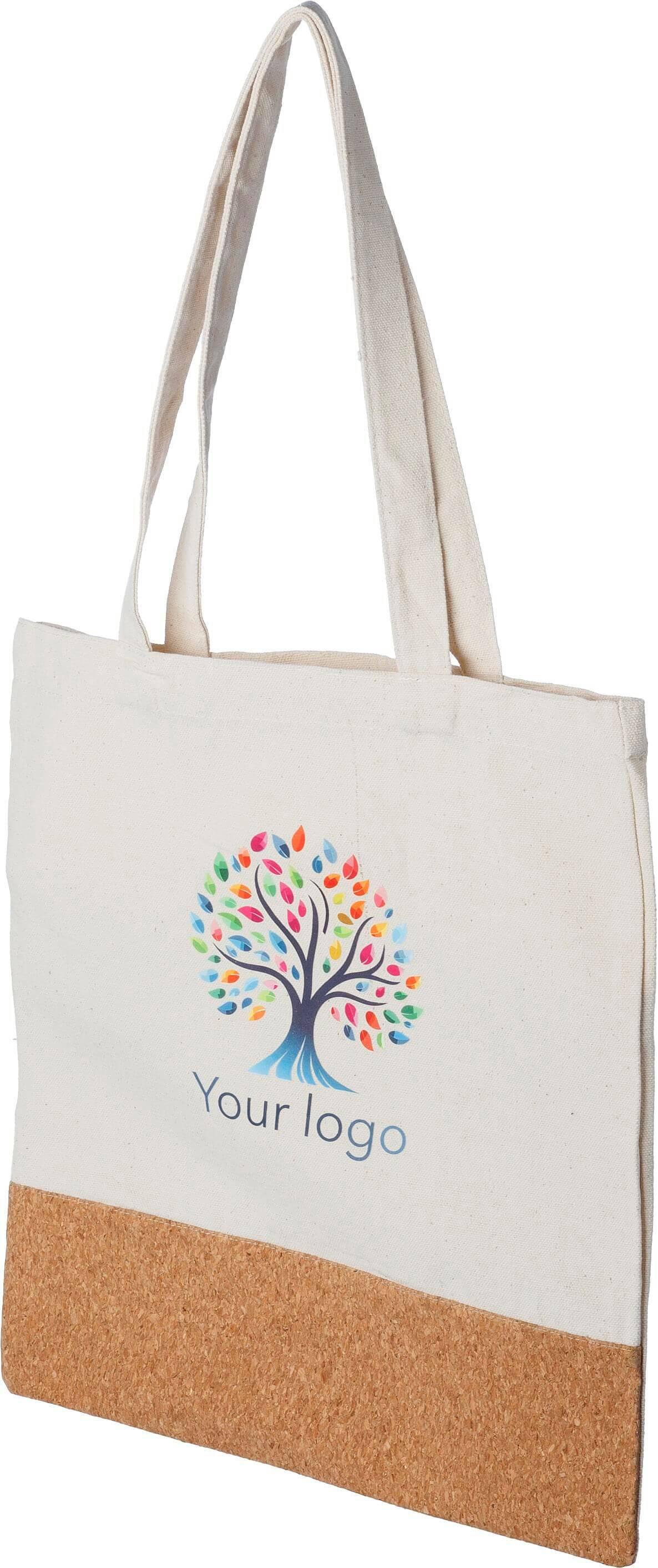 Saco de compras de algodão (250 gr/m2) com tecido de cortiça. As pegas têm um comprimento de 58 cm.
