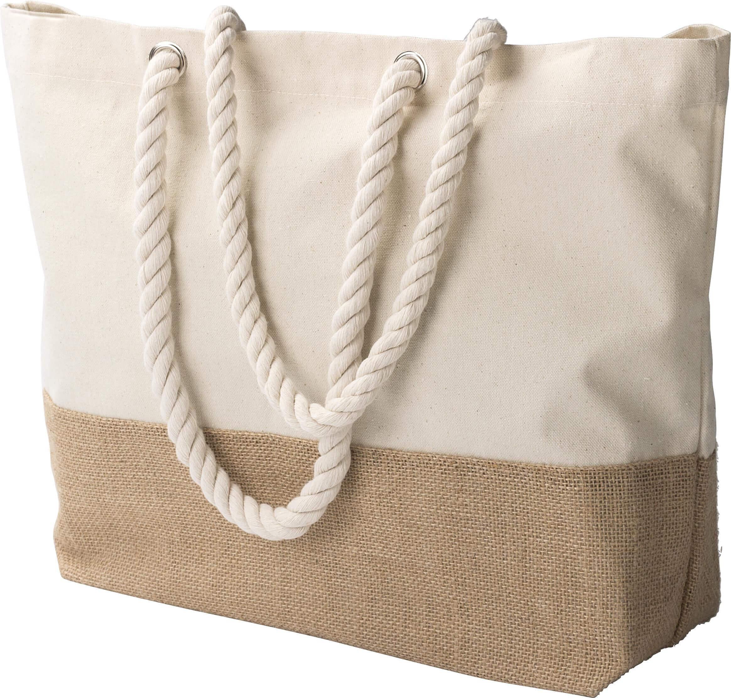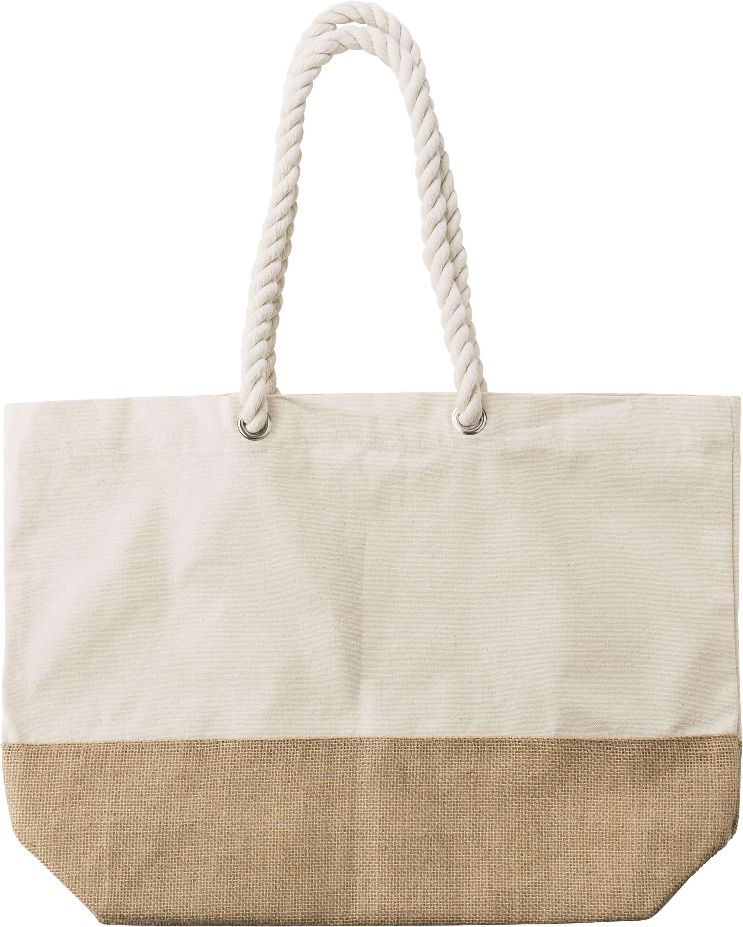 Saco de compras em algodão (280 g/m2) com detalhe em juta na parte inferior. Com pegas compridas em algodão entrelaçado.