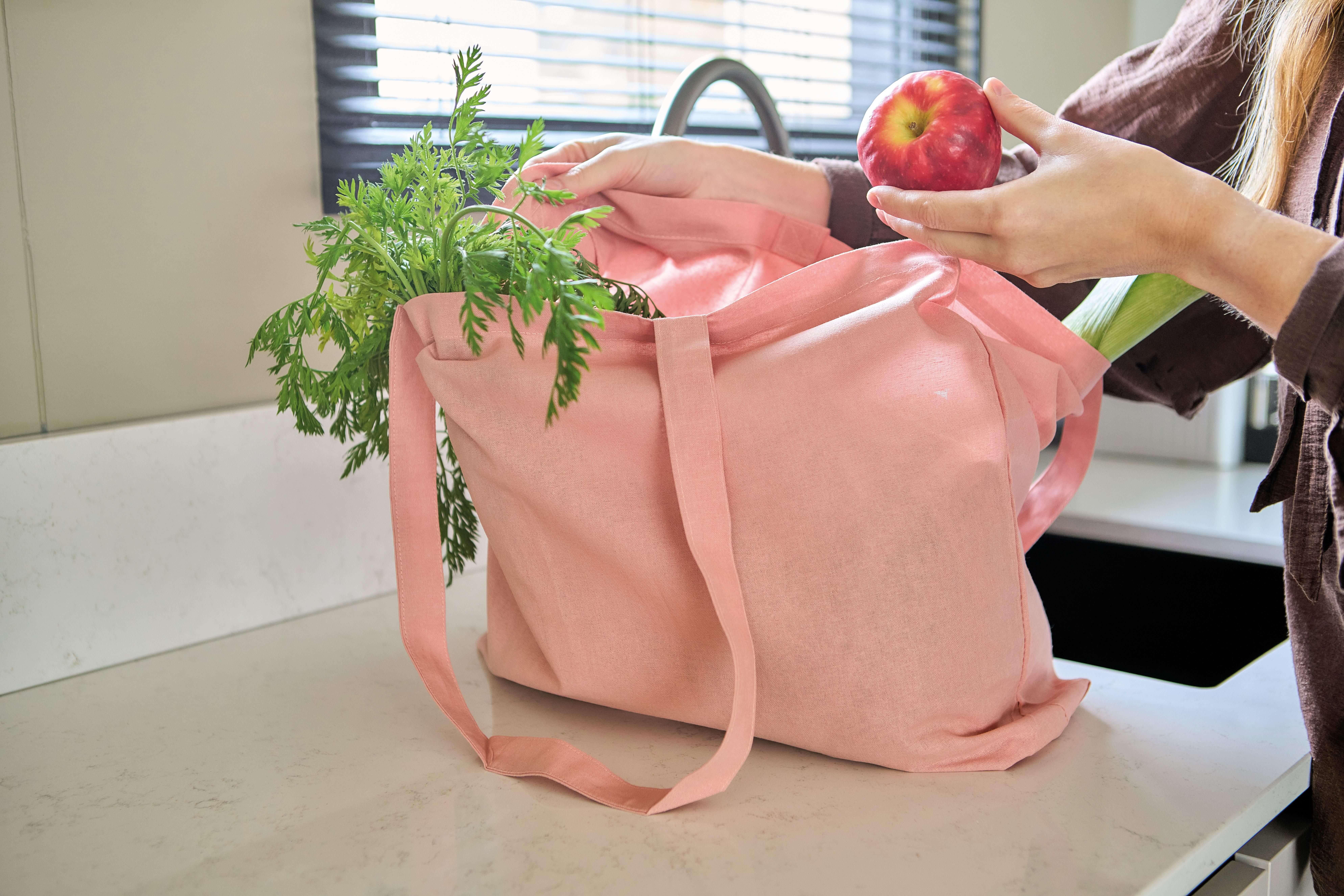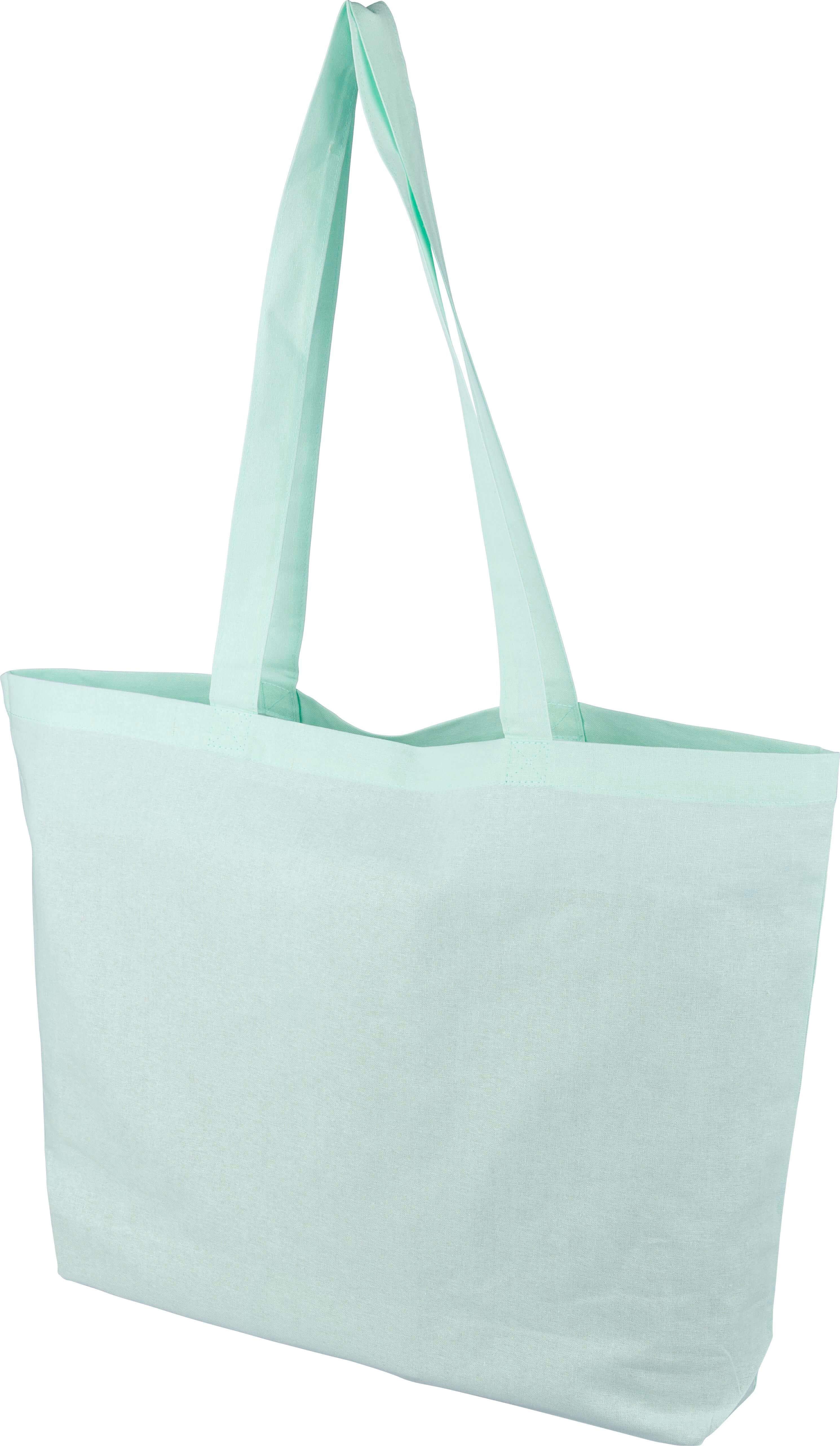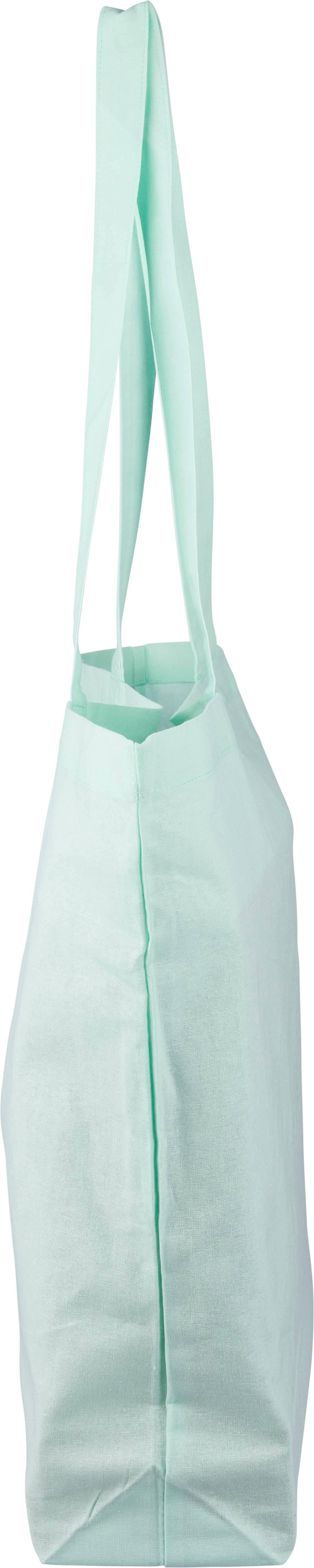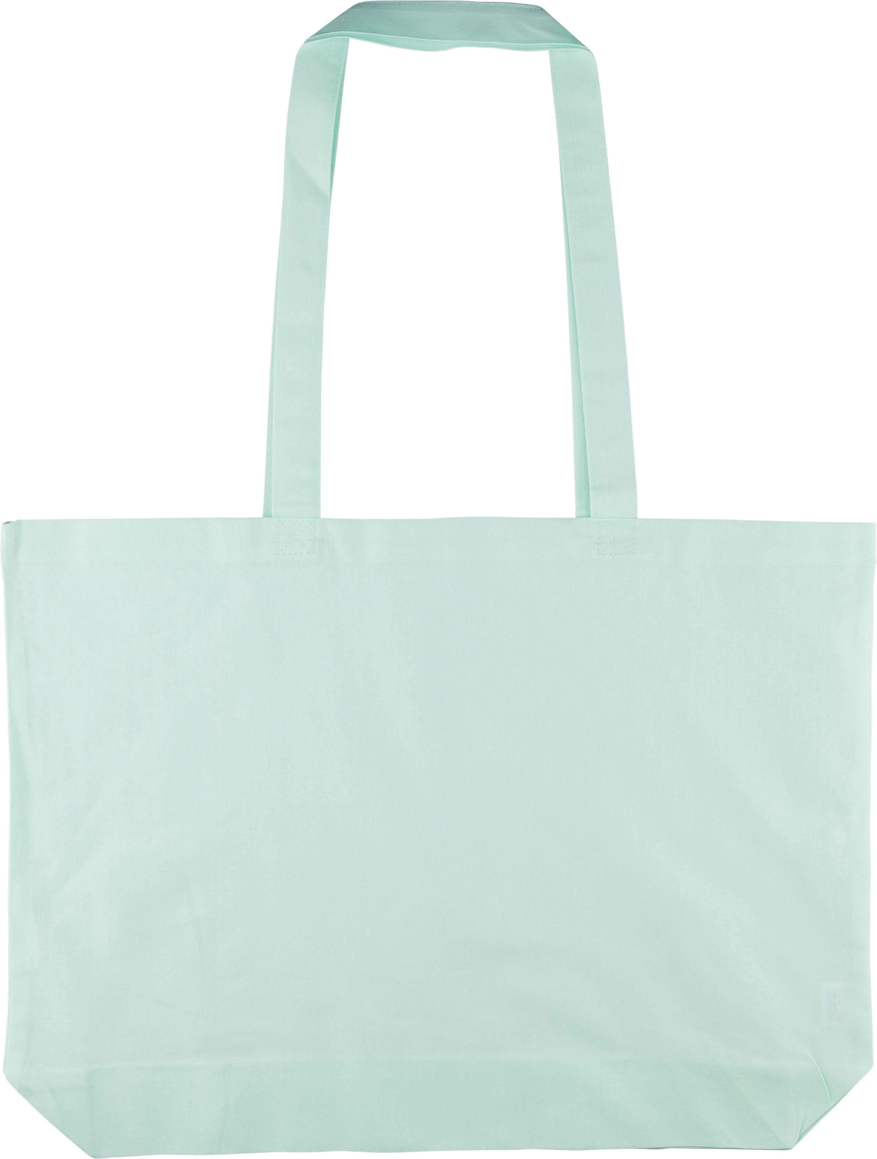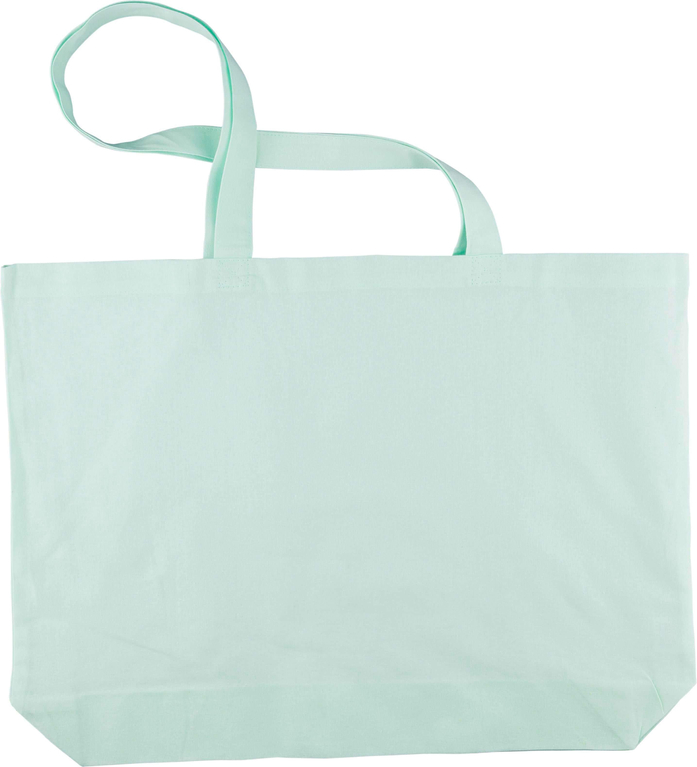 Saco de compras em algodão (140 g/m²) com reforço de 10 cm e alças compridas (70 cm de comprimento, 2,5 cm de largura). Algodão em tons pastel nas cores PMS 9562U (verde), 162U (laranja), 317U (azul) e 522U (roxo). Este produto é certificado OEKO-TEX® STANDARD 100.