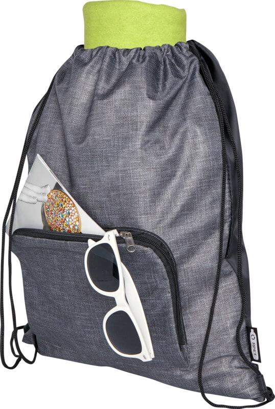O saco de cordão dobrável reciclado “Ash” possui um compartimento principal com fecho de cordão e um bolso frontal com fecho de correr no qual se pode inserir facilmente o saco dobrado para facilitar o transporte e armazenamento.