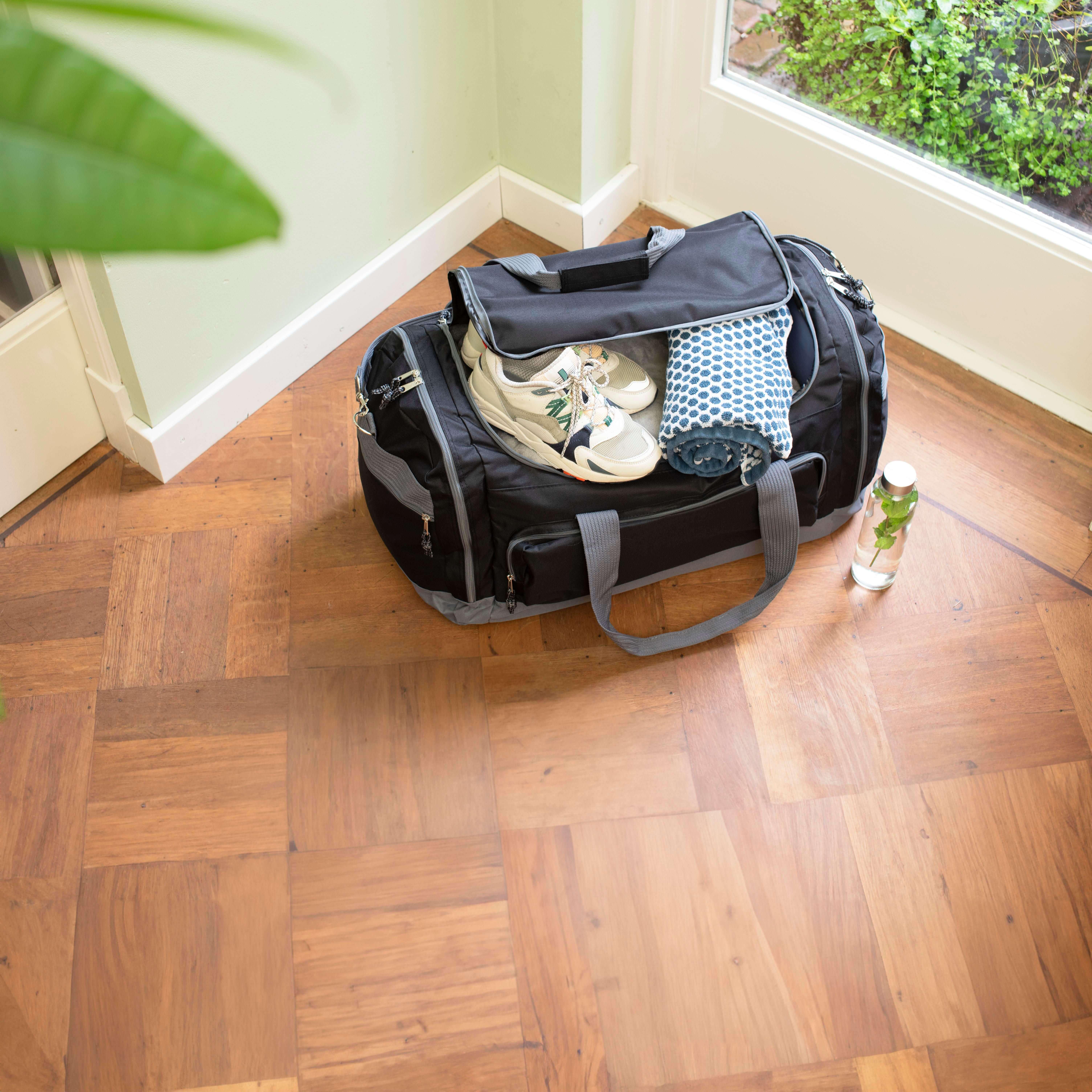 Saco de desporto/viagem de poliéster 600D, compartimento principal, 3 bolsas laterais e bolsa frontal, todos com fecho de correr, alça e alça de transporte removível ajustável.