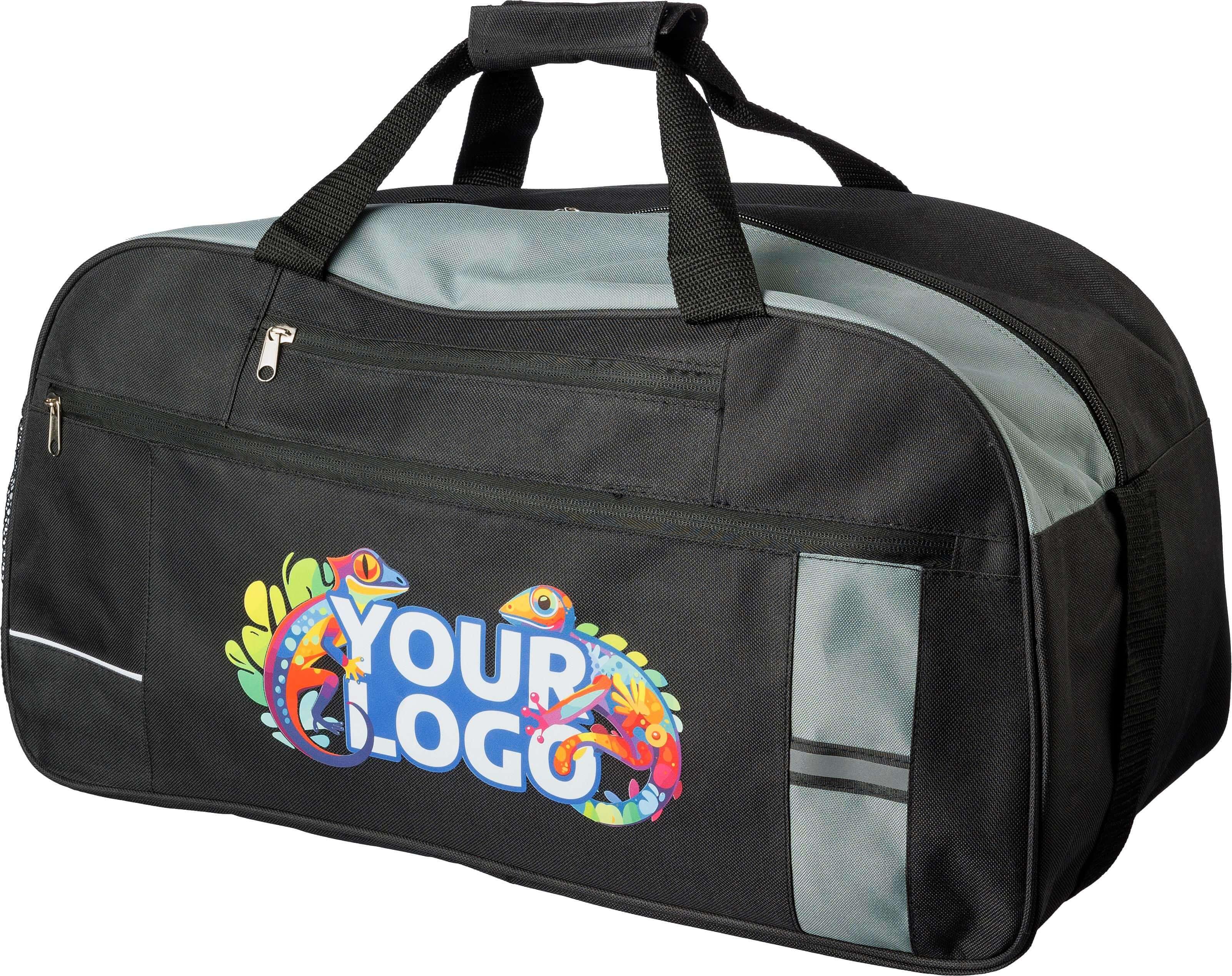 Saco de desporto ou de viagem em poliéster com vários compartimentos com fecho de correr e tira refletora. Com alça de transporte ajustável.