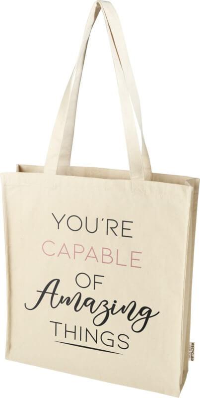 Feito de 100 % de algodão reciclado certificado GRS de 270 g/m², o saco de fole “Florida” garante uma escolha mais responsável e durável para as suas necessidades diárias. Com capacidade para até 14 litros e com alças de 30 cm de comprimento, este saco é perfeito para transportar compras, livros ou bens essenciais do dia a dia sem esforço.