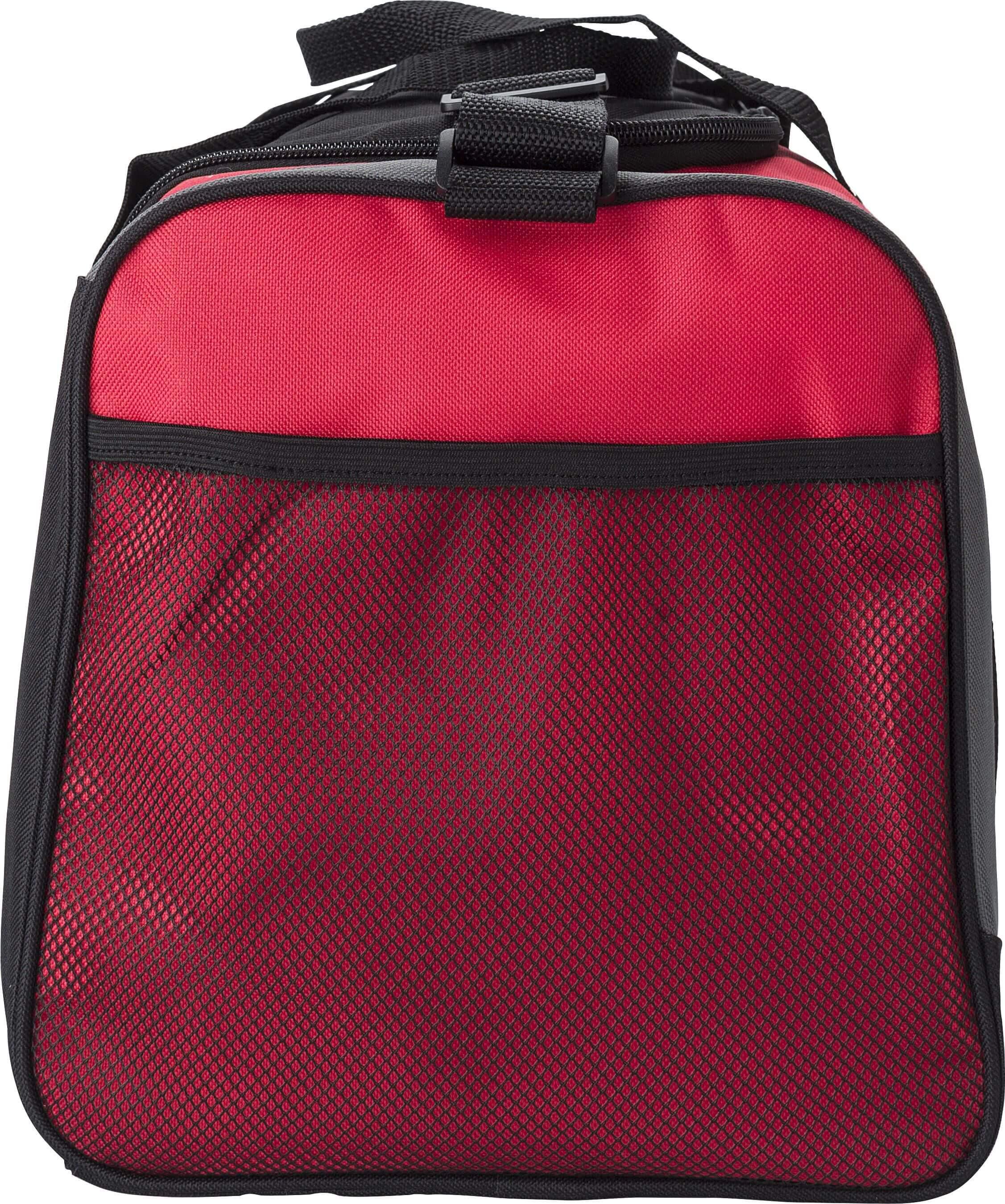 Saco de lona em poliéster (600D) com pegas curtas e alça ajustável. Um compartimento grande com fecho de correr, um bolso de rede na lateral, 3 bolsos à frente. Fundo reforçado.