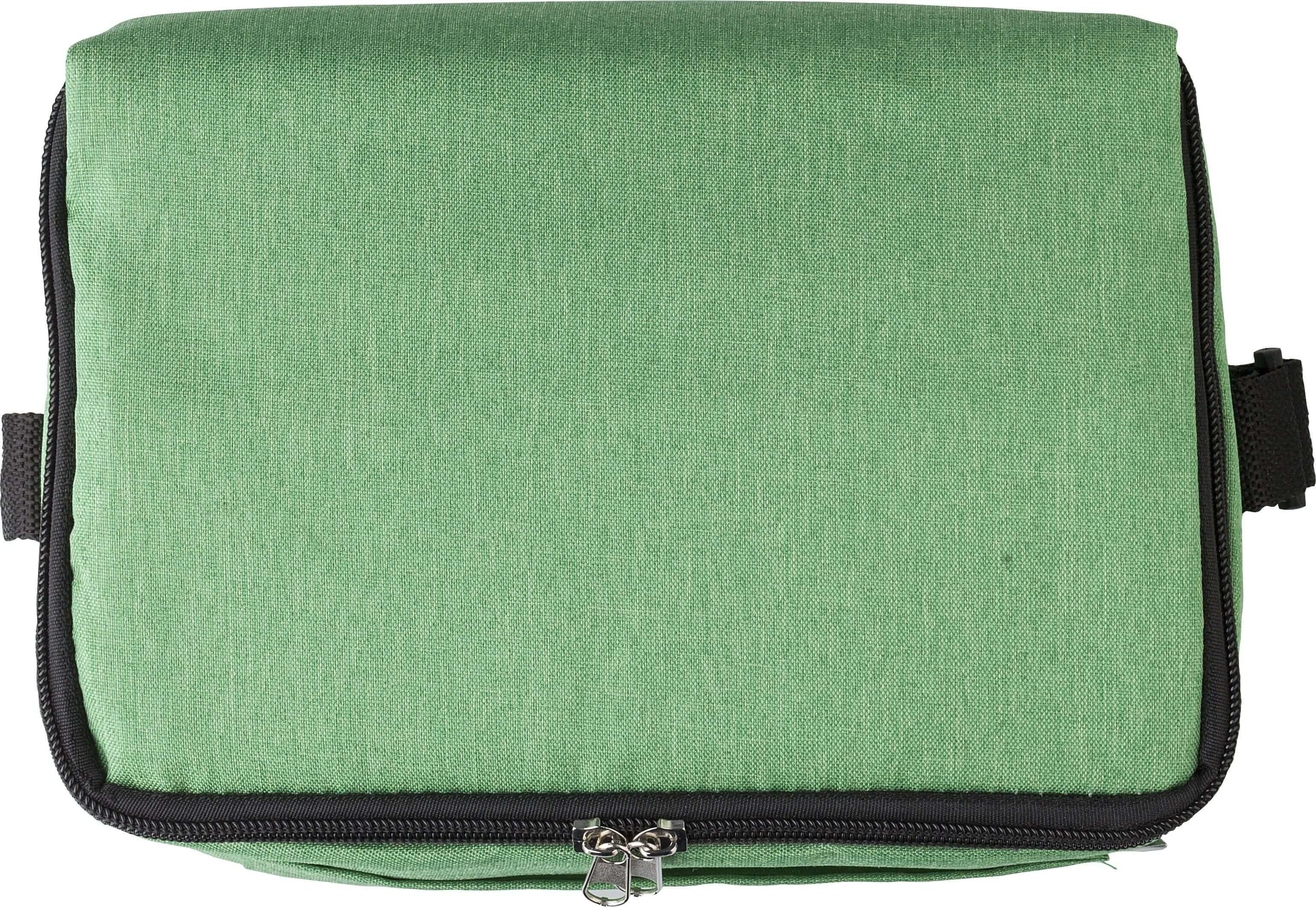 Saco de poliéster (600D) e refrigerador rPET com interior em PEVA, para seis latas de 330 ml. Com fecho de correr, bolso frontal, e alça ajustável. Capacidade: 3 litros.