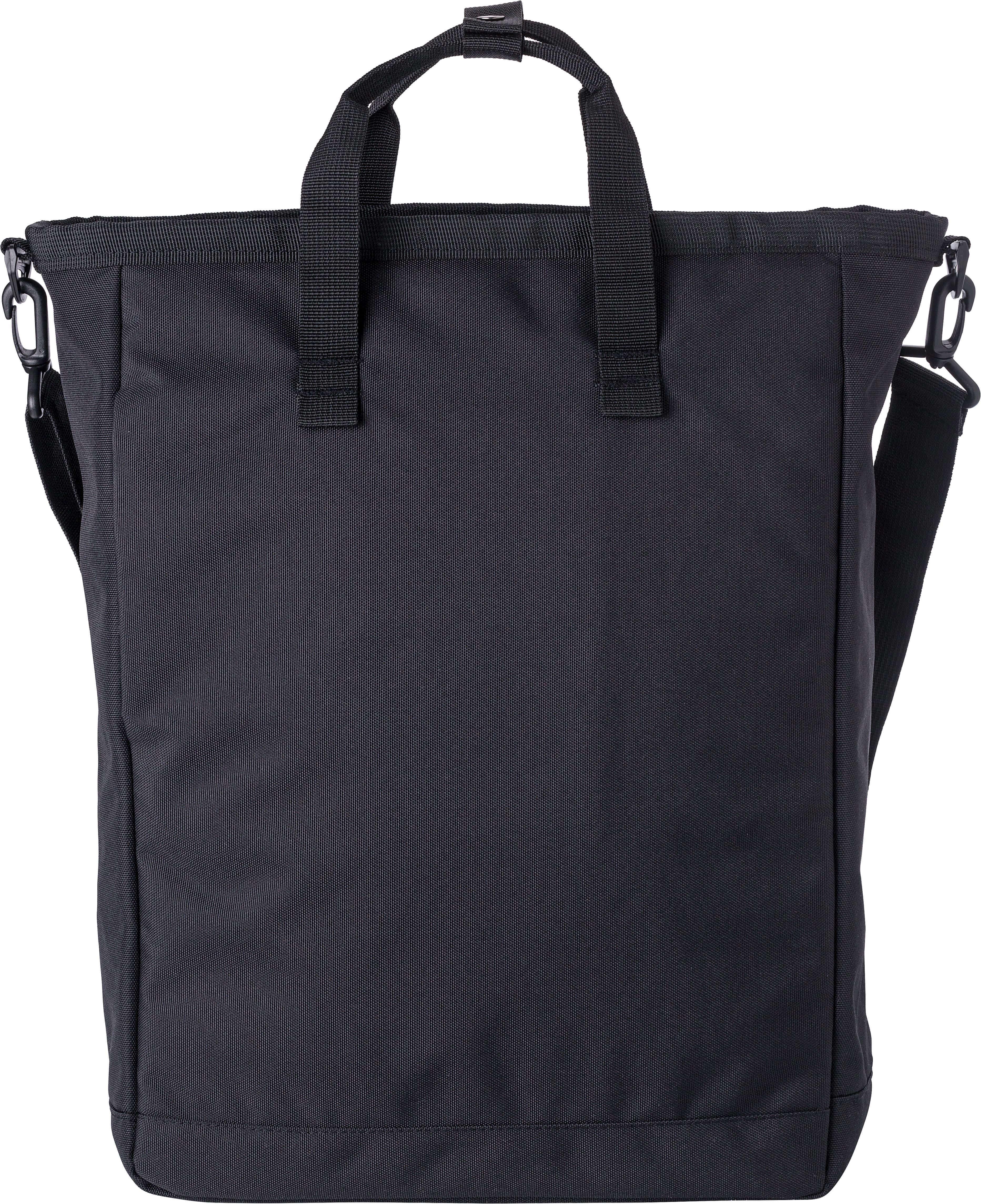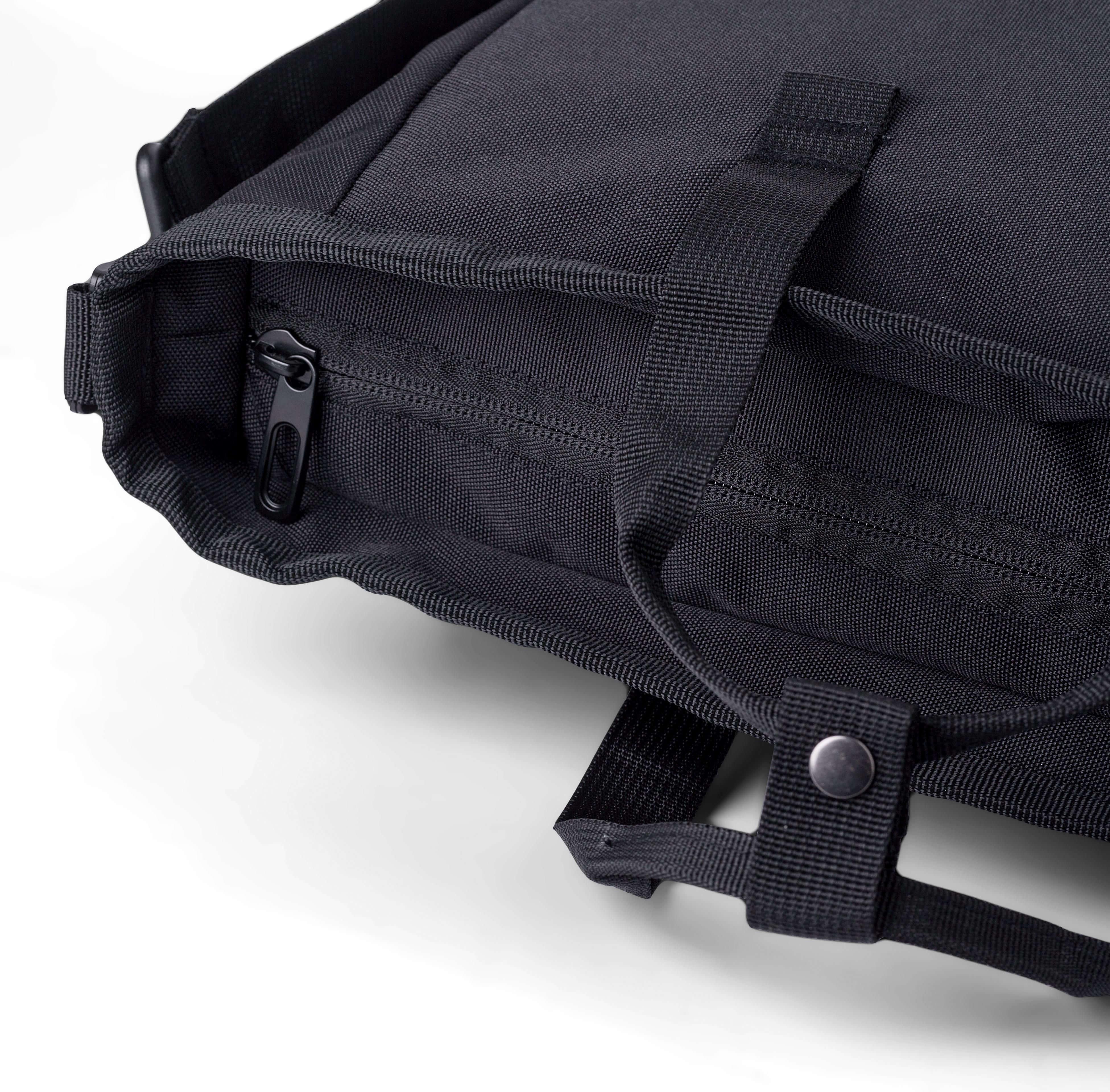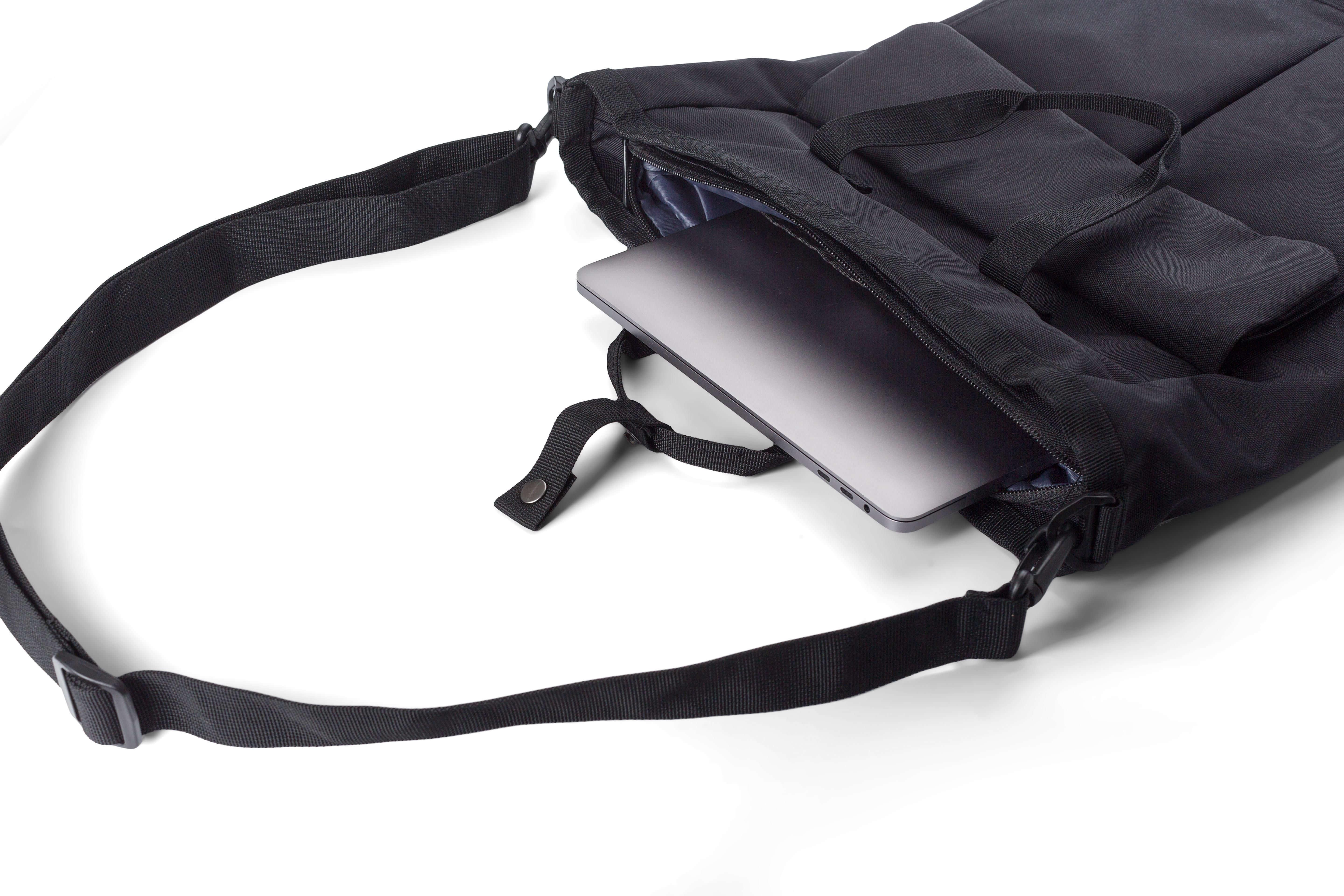 Saco de tiracolo em poliéster (900D). Dois bolsos com fecho de velcro na frente, um compartimento grande com fecho de correr na parte superior e um compartimento com fecho de correr na parte de trás. Vários compartimentos no interior, incluindo um compartimento para computador portátil (15’’). Alças de ombro ajustáveis e pegas curtas.