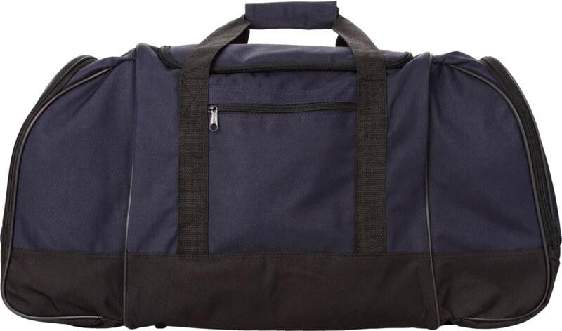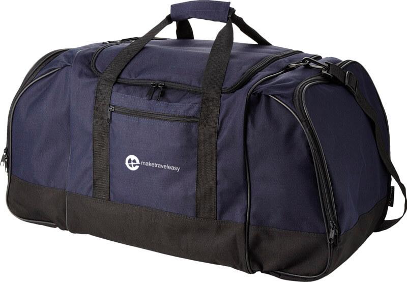 Saco de viagem com alça de ombro ajustável, grandes bolsos laterais e bolso frontal.