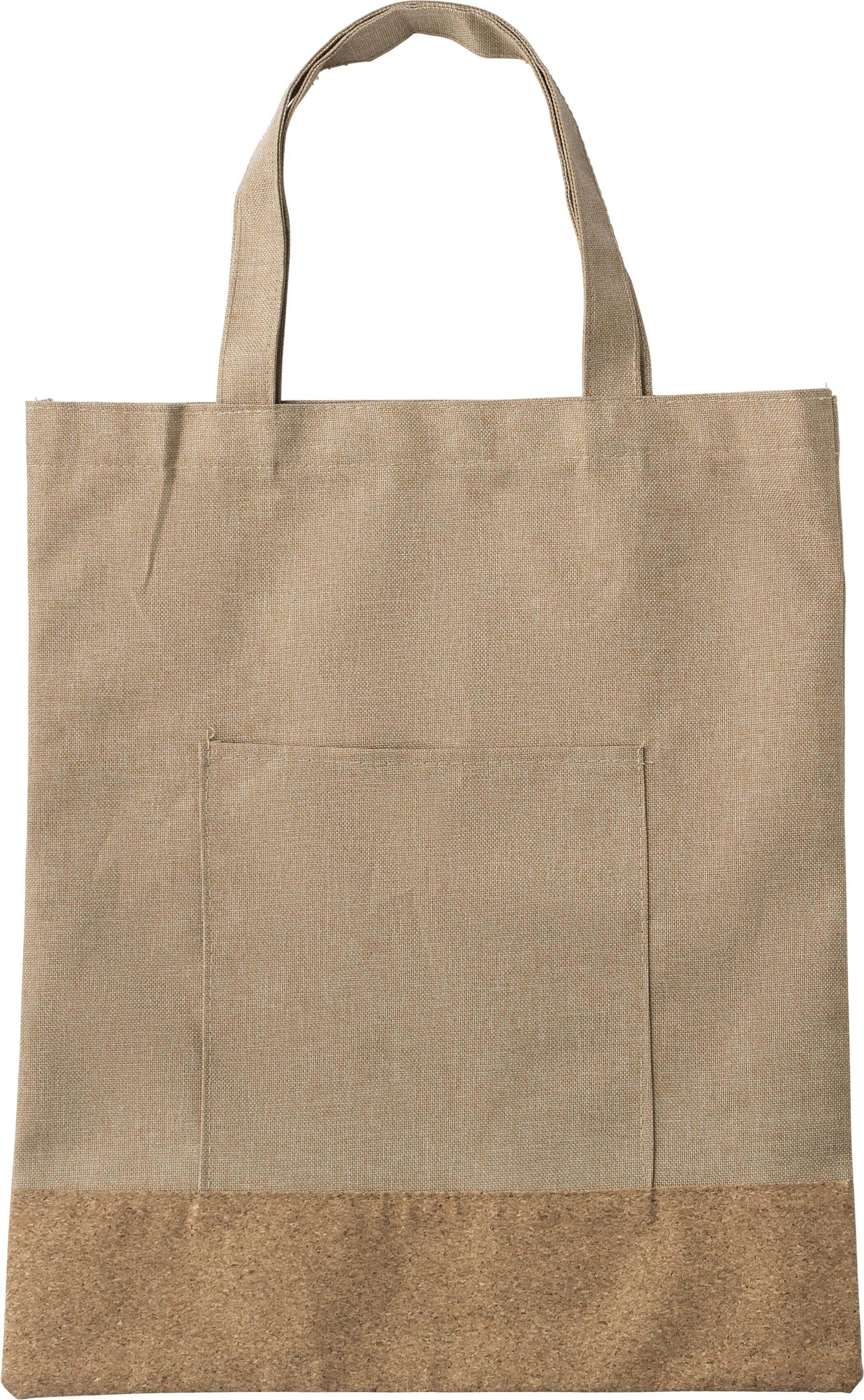 Saco em poliéster RPET (600D). Fundo em cortiça e cor natural. Pequeno bolso na frente. Pegas curtas. Com etiqueta RPET.