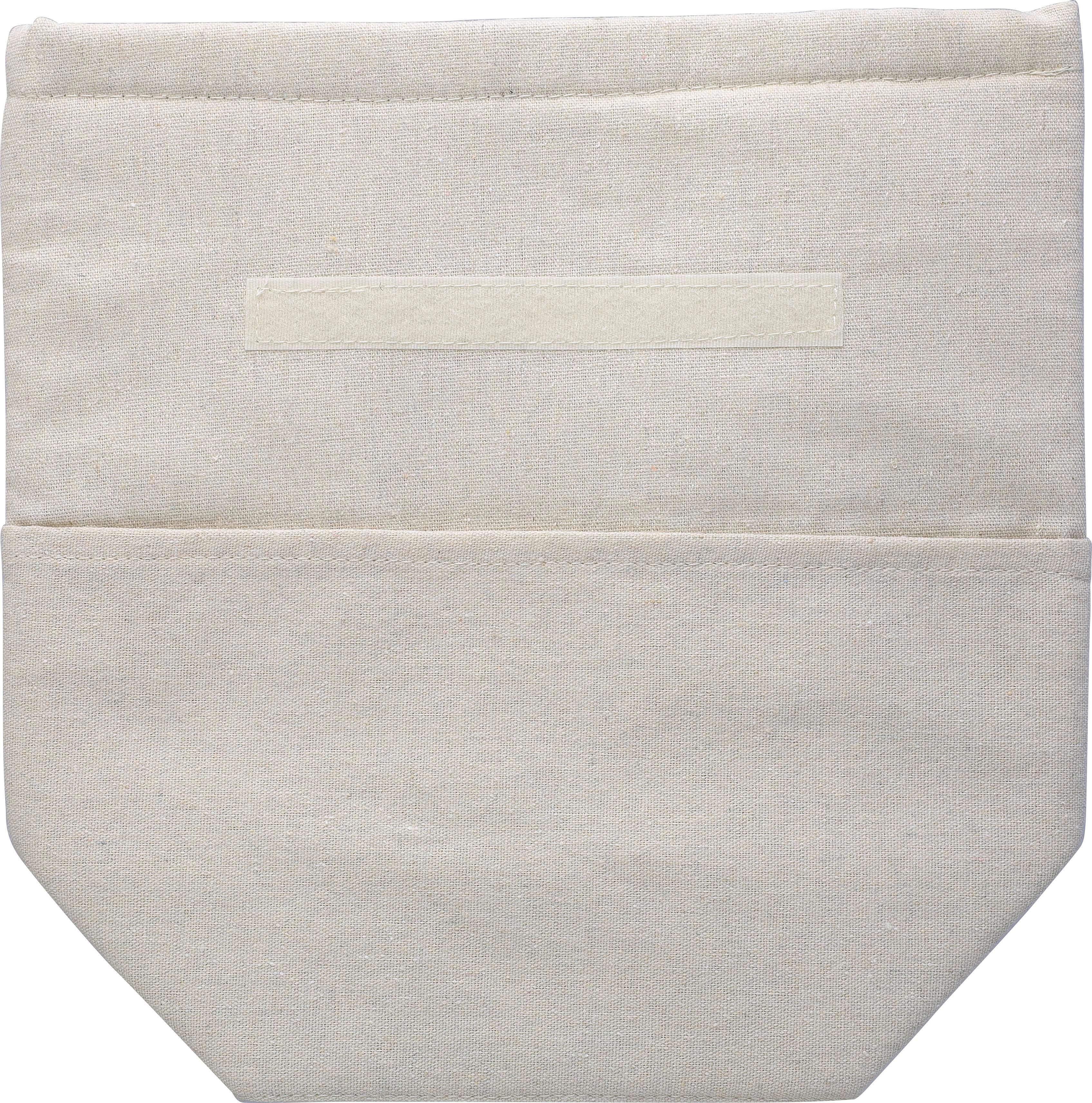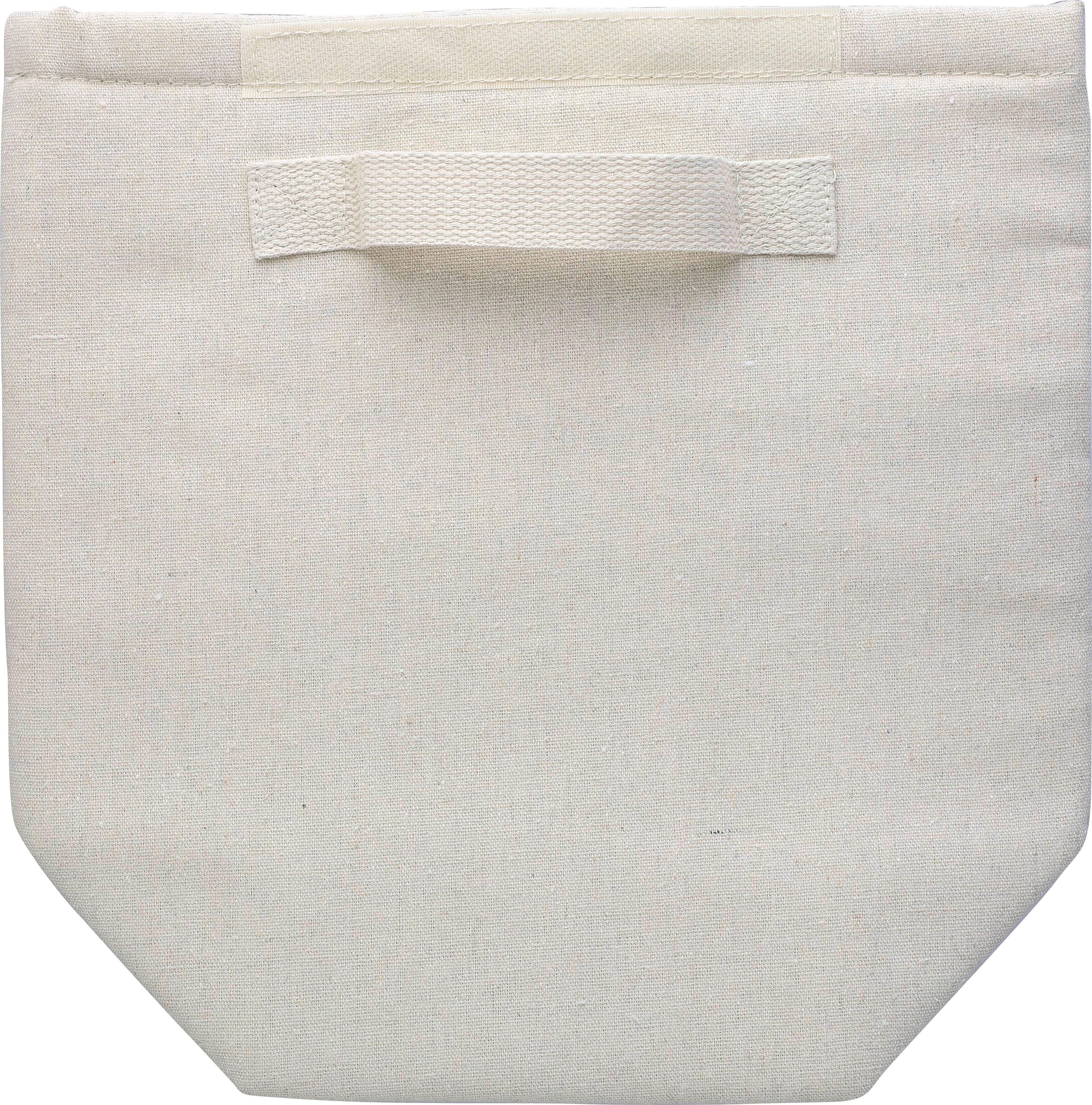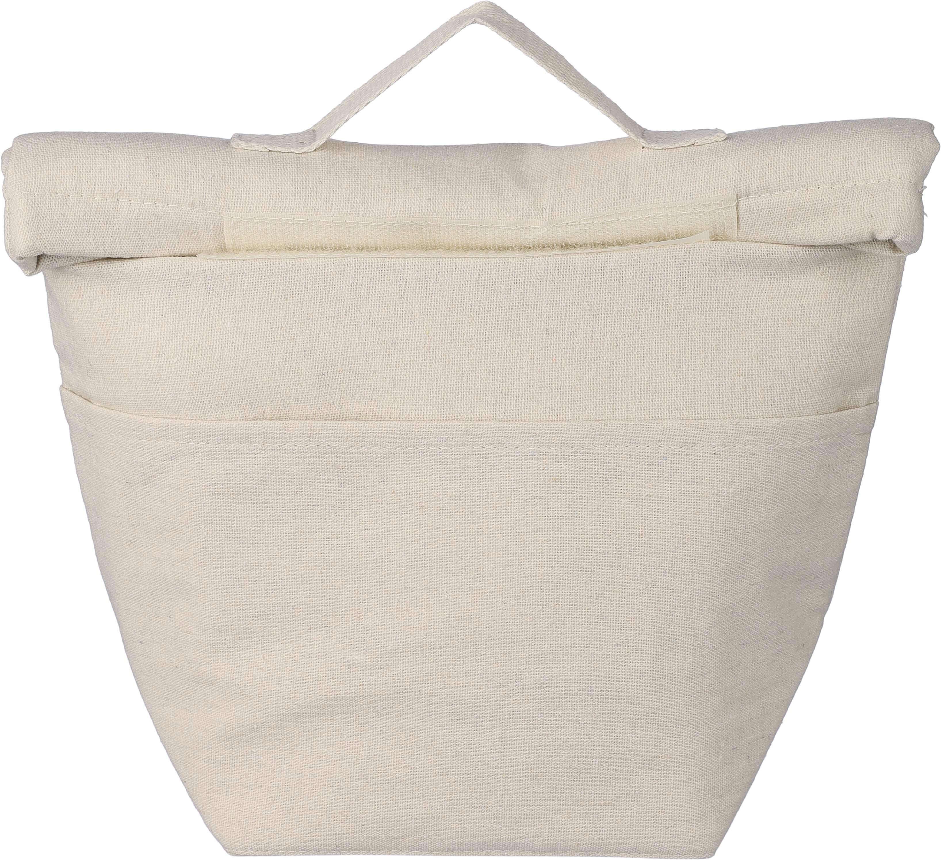 Saco térmico em algodão reciclado (220 g/m2) com tampa de rolo e revestimento interior em EPE de 3 mm e PEVA 12C. Possui fecho de velcro, um pequeno bolso frontal e uma alça de transporte curta na parte superior. Inclui etiqueta de algodão reciclado no exterior.