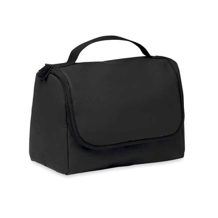 Saco organizador de cosméticos em PU macio com gancho para pendurar e forro em RPET 210D. Um compartimento principal grande com um compartimento interior de rede com fecho de correr e 1 compartimento de rede.