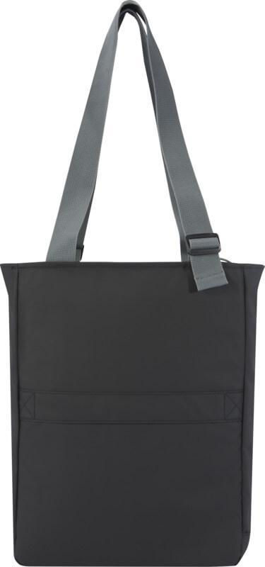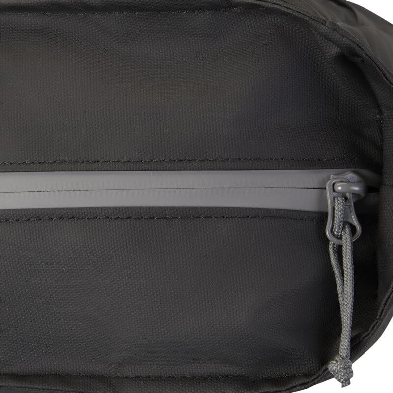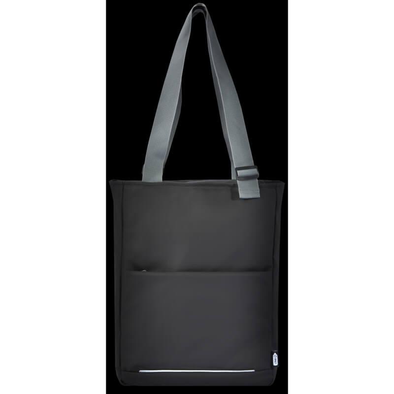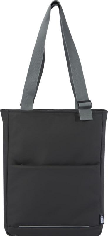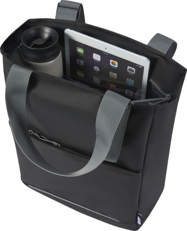 Saco para portátil impermeável feito de materiais reciclados com certificação GRS, incluindo os fechos de correr. Possui uma bolsa dedicada para tablet, um compartimento para portátil de 14″, vários bolsos para organização, um bolso frontal com painel de organização, alças ajustáveis de 35 cm de comprimento e uma alça para bagagem. Os materiais reciclados GRS incluem o tecido principal, forro, alças e fechos de correr. Capacidade: 14 litros. Sem PVC.