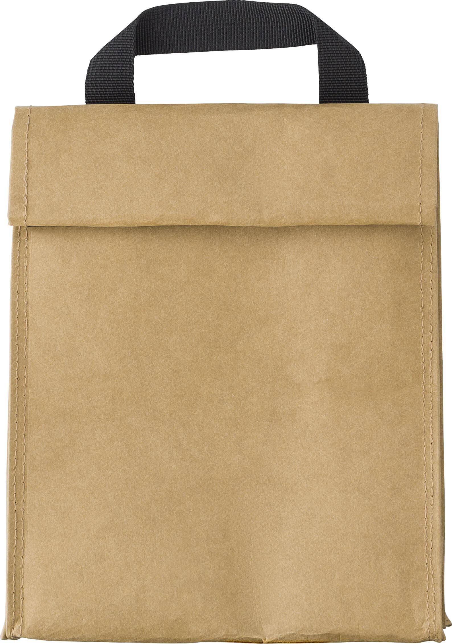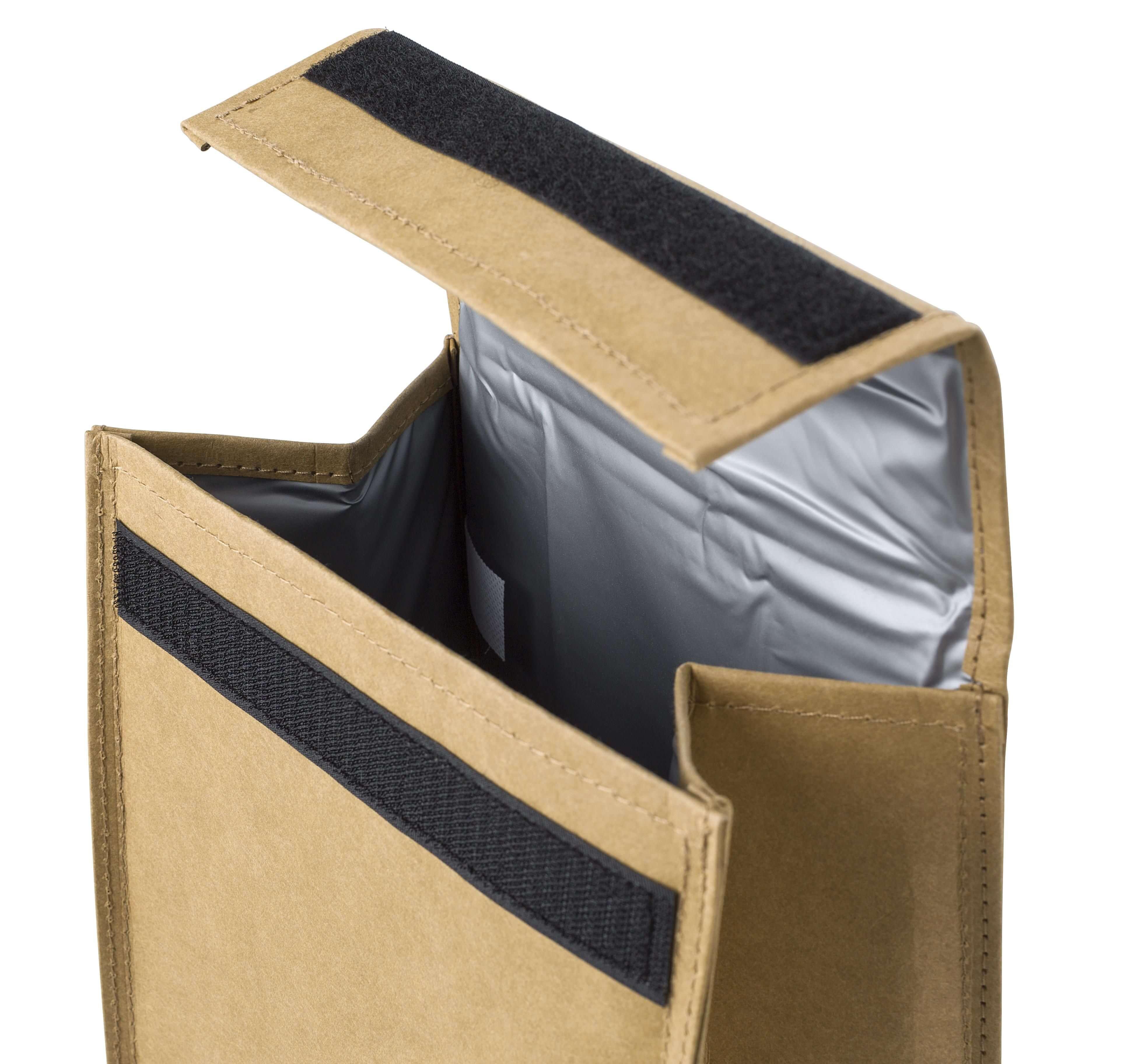 Saco isotérmico em papel kraft lavado com forro em PEVA (15C). Pega curta e fecho de velcro resistente.