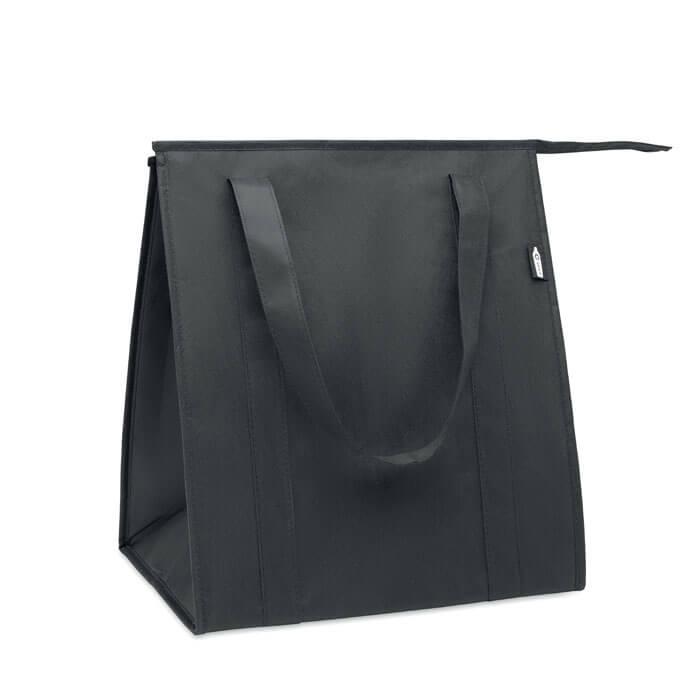 Saco térmico em RPET não tecido (não tecido) 80gr/m². Material de isolamento: folha de alumínio. Capacidade 25L. Compartimento principal com fecho de correr e reforço amovível em cartão PP.