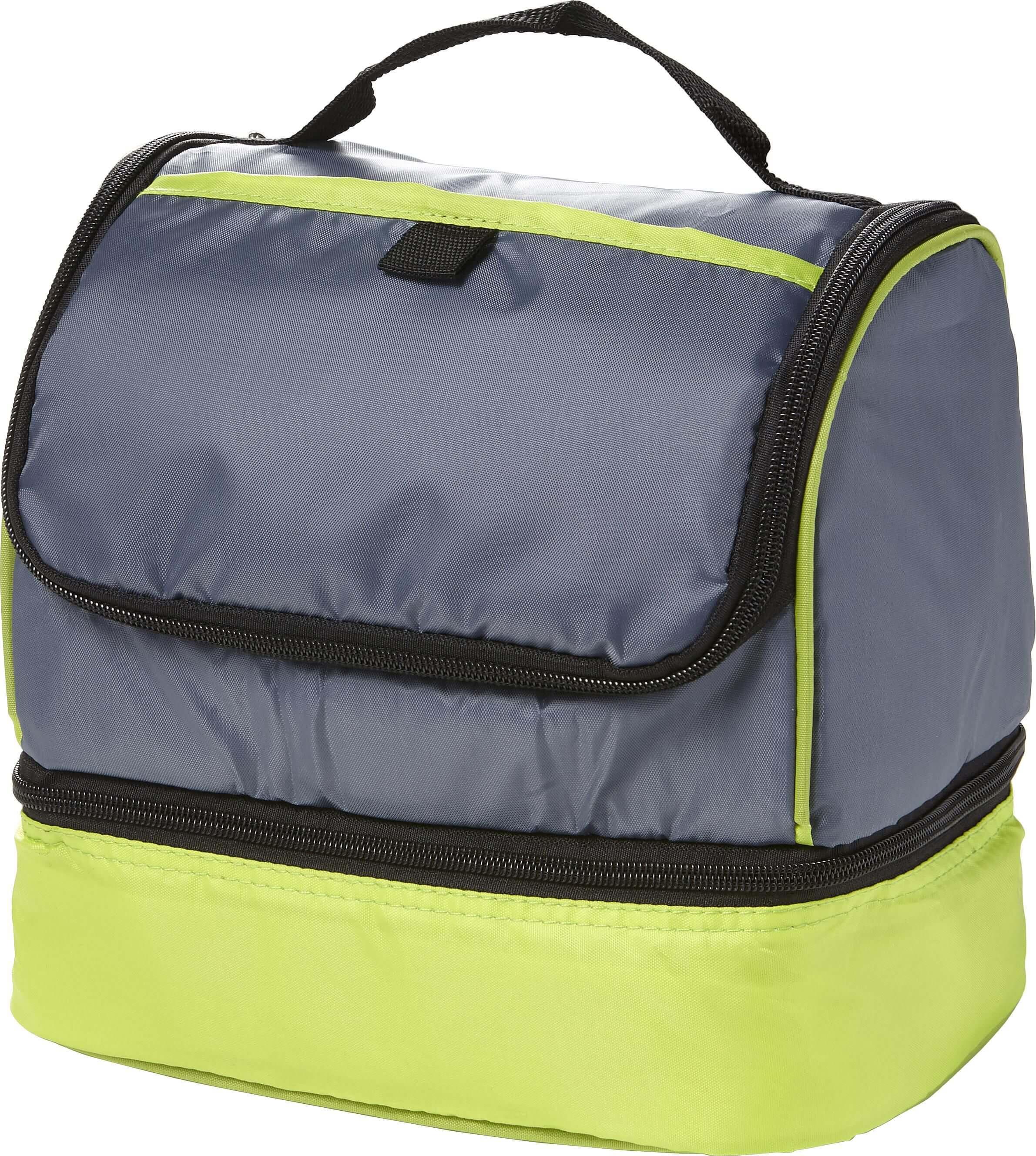 Saco térmico em poliéster (210D) com geleira independente na parte inferior e bolso de malha nas laterais.