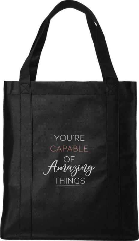 O saco tote Liberty em não tecido, tem uma base de apoio no fundo, tornando-o um saco de tote versátil e sólido. O grande compartimento principal proporciona espaço suficiente para armazenar vários artigos, e as pegas de 25,4 cm de comprimento tornam esta bolsa fácil de transportar. Para além de tudo isto, as grandes áreas de impressão são ideais para a máxima visibilidade de qualquer logótipo.