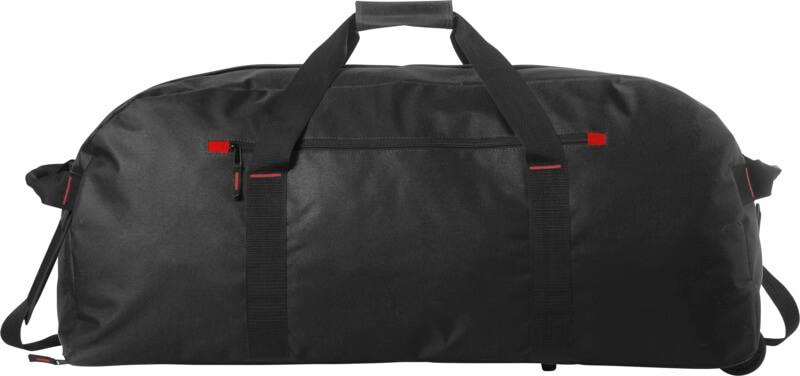 Saco de viagem grande com compartimento principal com fecho, bolso frontal com fecho e sistema de trólei.