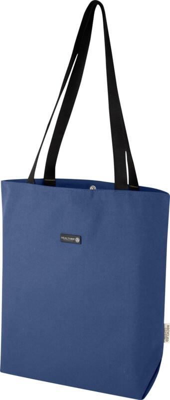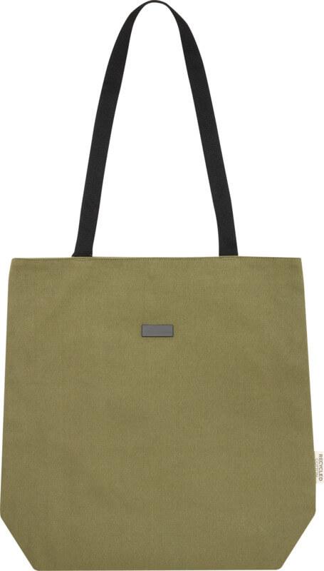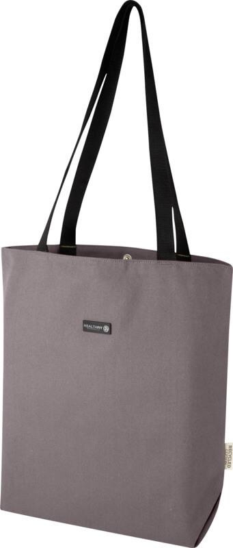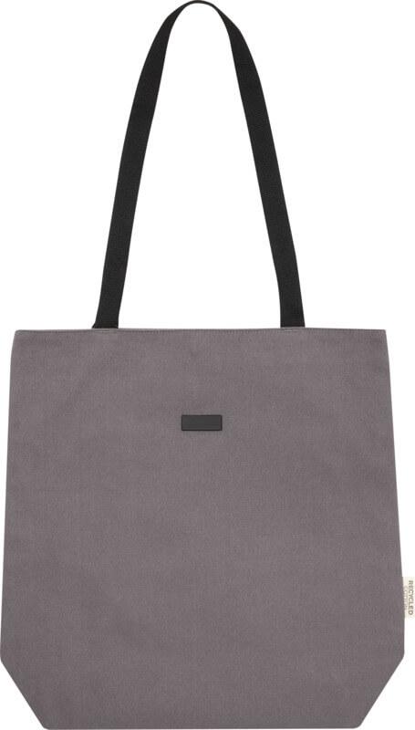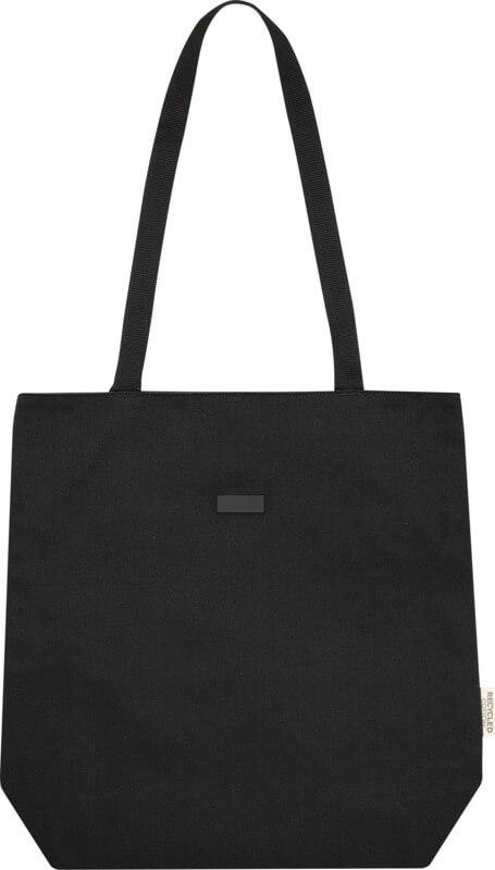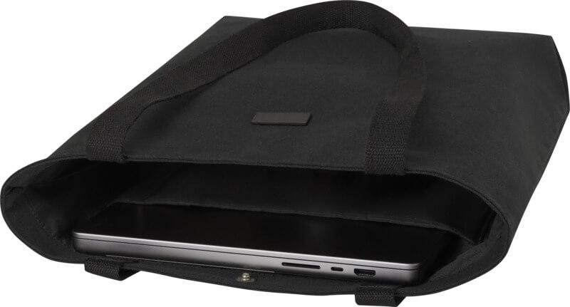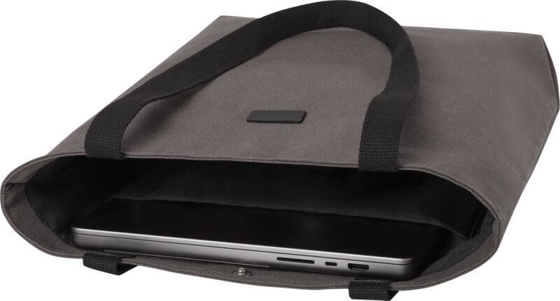 Saco feita de lona reciclada com certificação GRS e forro de RPET com certificação GRS. Este saco versátil possui um compartimento acolchoado para portátil de 15″ e dois bolsos de manga no interior para um telefone, carteira ou acessórios, e um fecho de botão fácil para a abertura e alças confortáveis de algodão. A placa de metal decorativa pode fazer um logótipo brilhar através do seu acabamento subtil e mate.